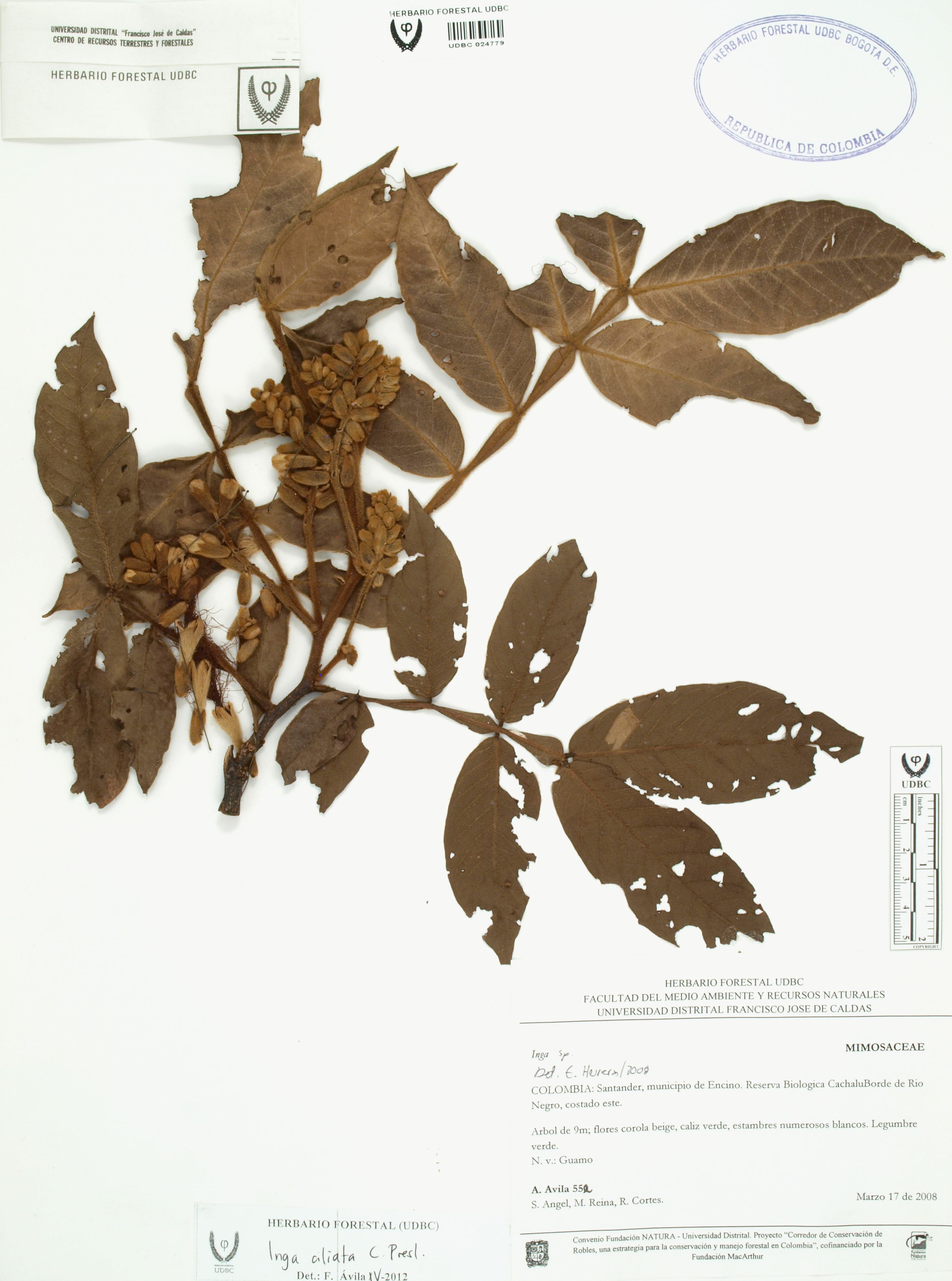 Fotografía del ejemplar Ávila, F. 552, determinado como Inga ciliata en el año 2012