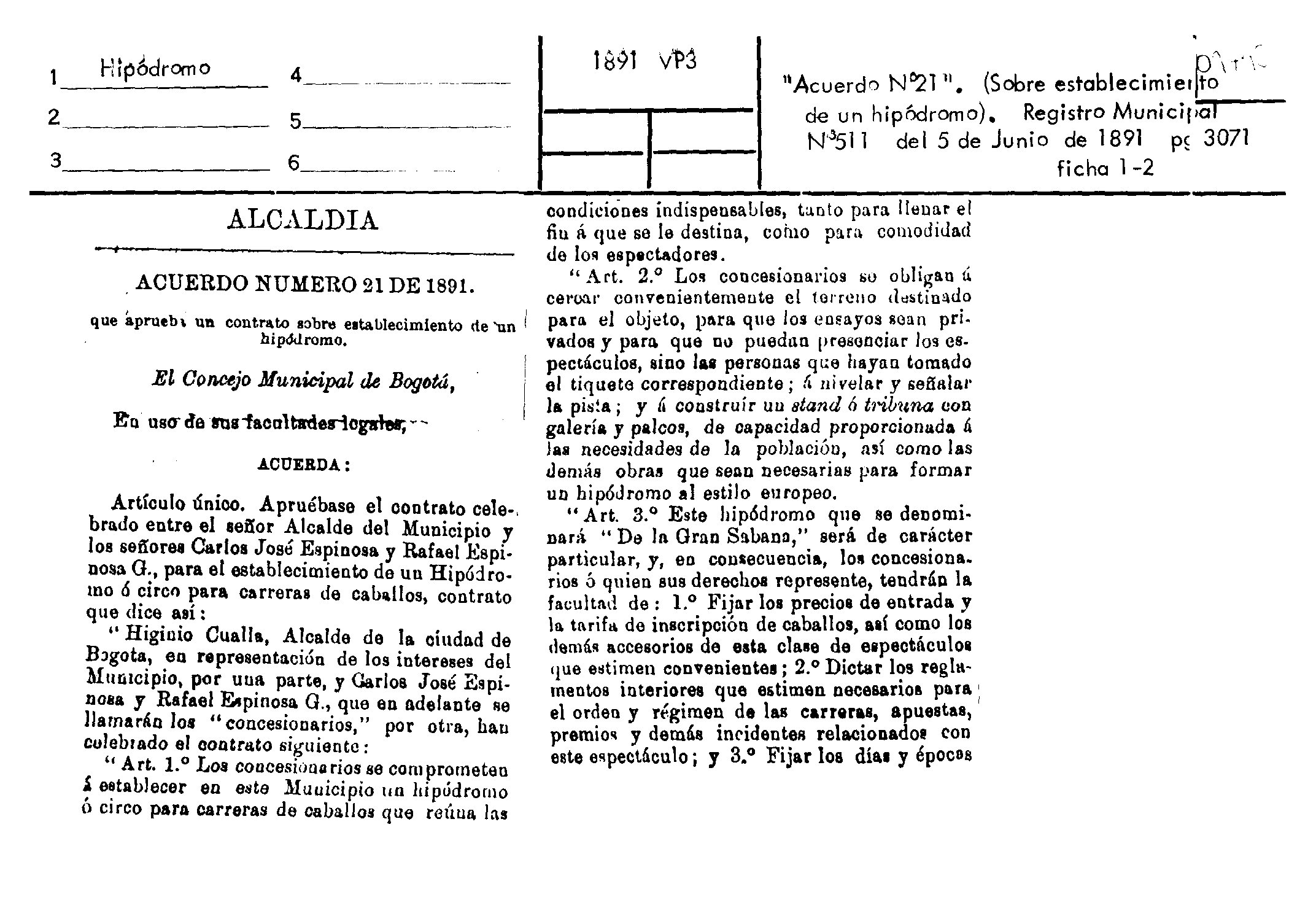 The image contains a notice about the Agreement Number 21 of 1891 in which a contract on the establishment of a racetrack is approved, this by the Municipal Council of Bogota in use of its powers, therefore it is agreed that the contract with the Mayor of the Municipality and Mr. Carlos José Espinosa and Rafael Espinosa G. is approved, for the establishment of a Hippodrome or a circus for horse racing, defining the latter as the concessionaires that will have certain commitments such as the establishment in the Municipality of such place which will have the necessary conditions according to the purpose of the same and the comfort of the spectators. Additionally, it is mentioned that the new Racetrack will be named De la Gran Sabana and this will be of particular character and the concessionaires will have the capacity to define the entrance and registration fees of the horses and everything concerning the show, including the rules for the development of the same. Finally it is stipulated that to ensure compliance with said contract the concessionaires shall pay a bond of 5000 pesos in favor of the Municipality and the need for approval of the Honorable Municipal Council.
