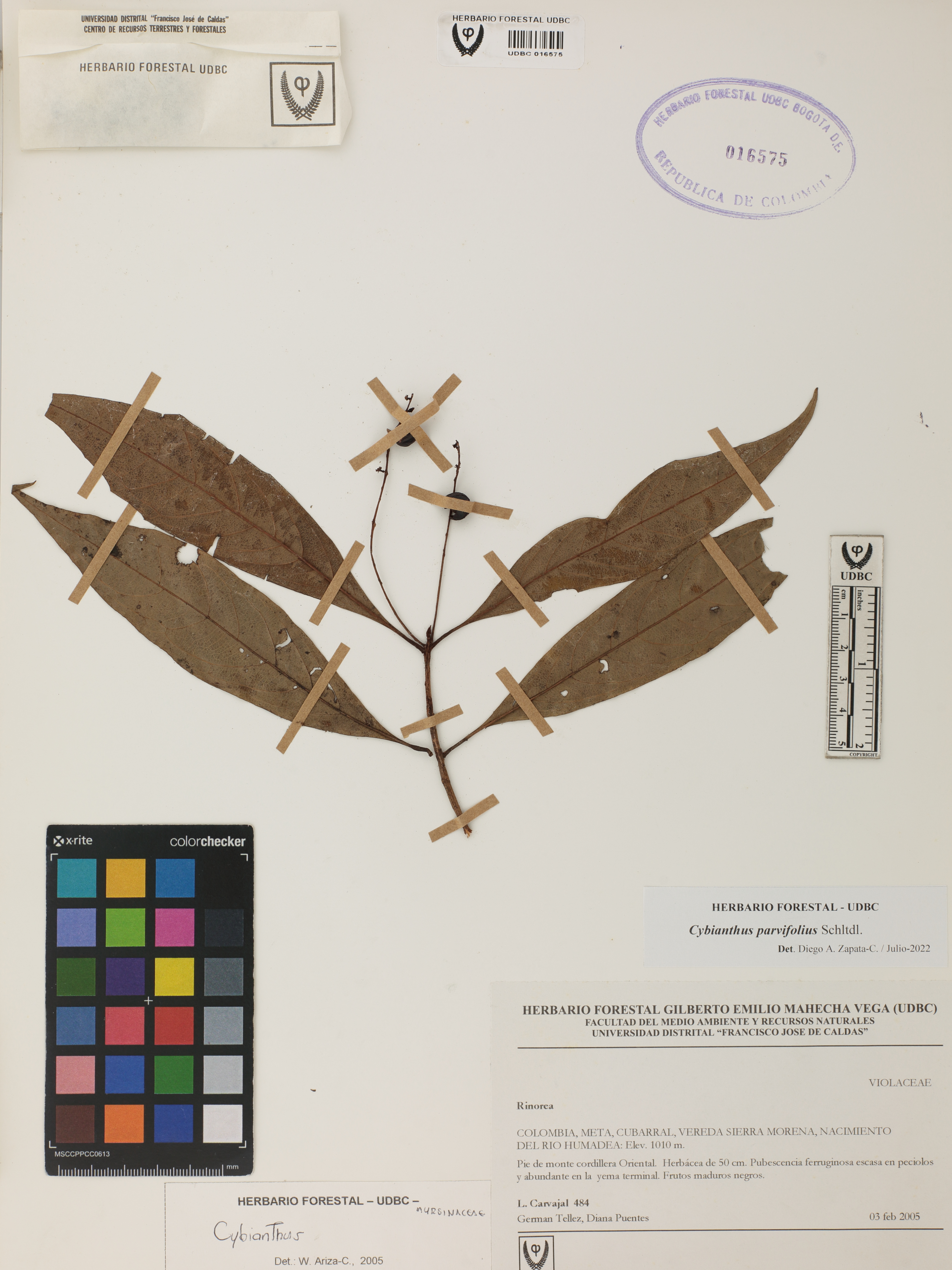Fotografía del ejemplar Carvajal, L. 848, determinado como Cybianthus parvifolius en el año 2022