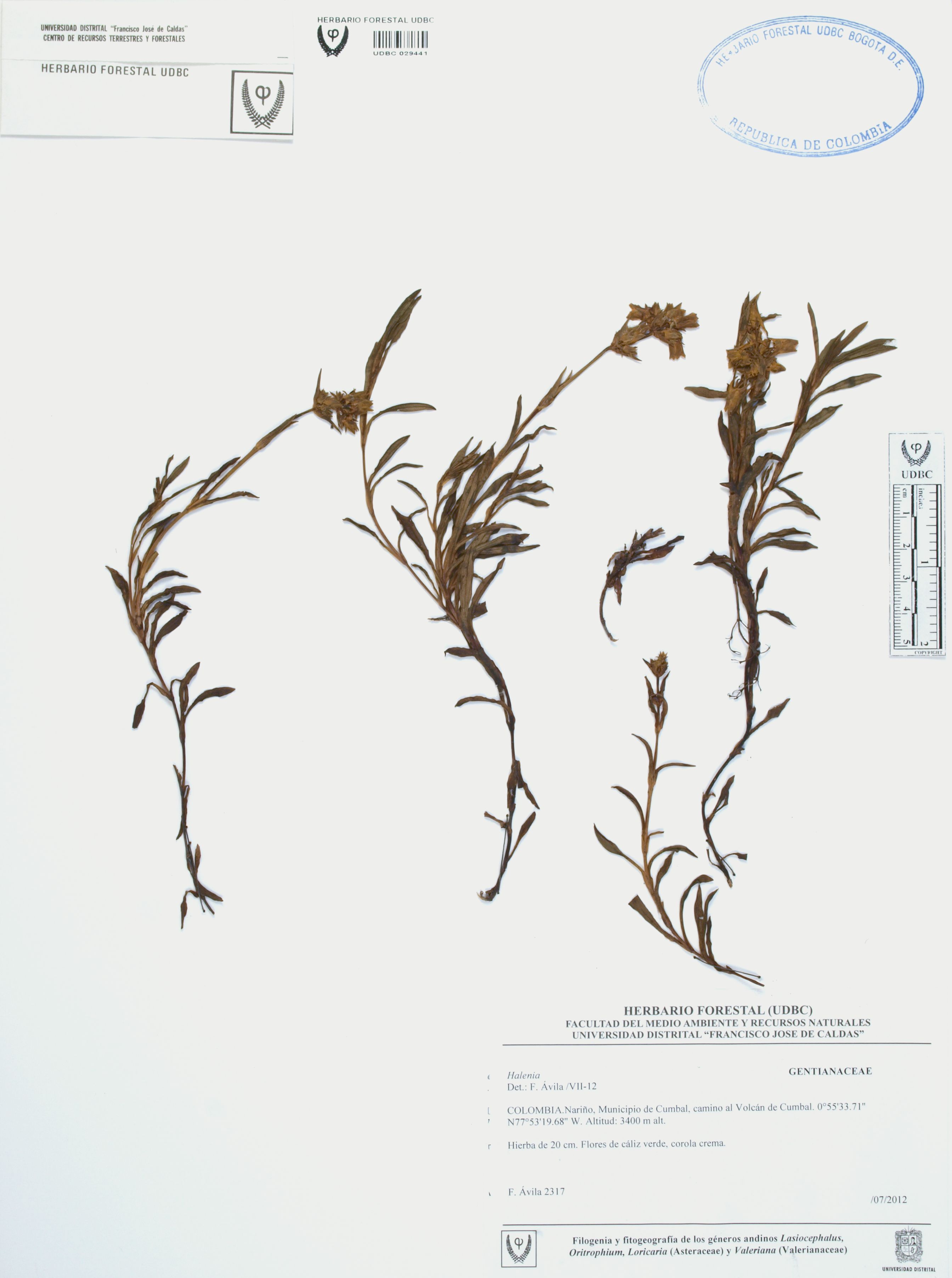 Fotografía del ejemplar Ávila, F. 2317, determinado como Halenia sp. en el año 2012