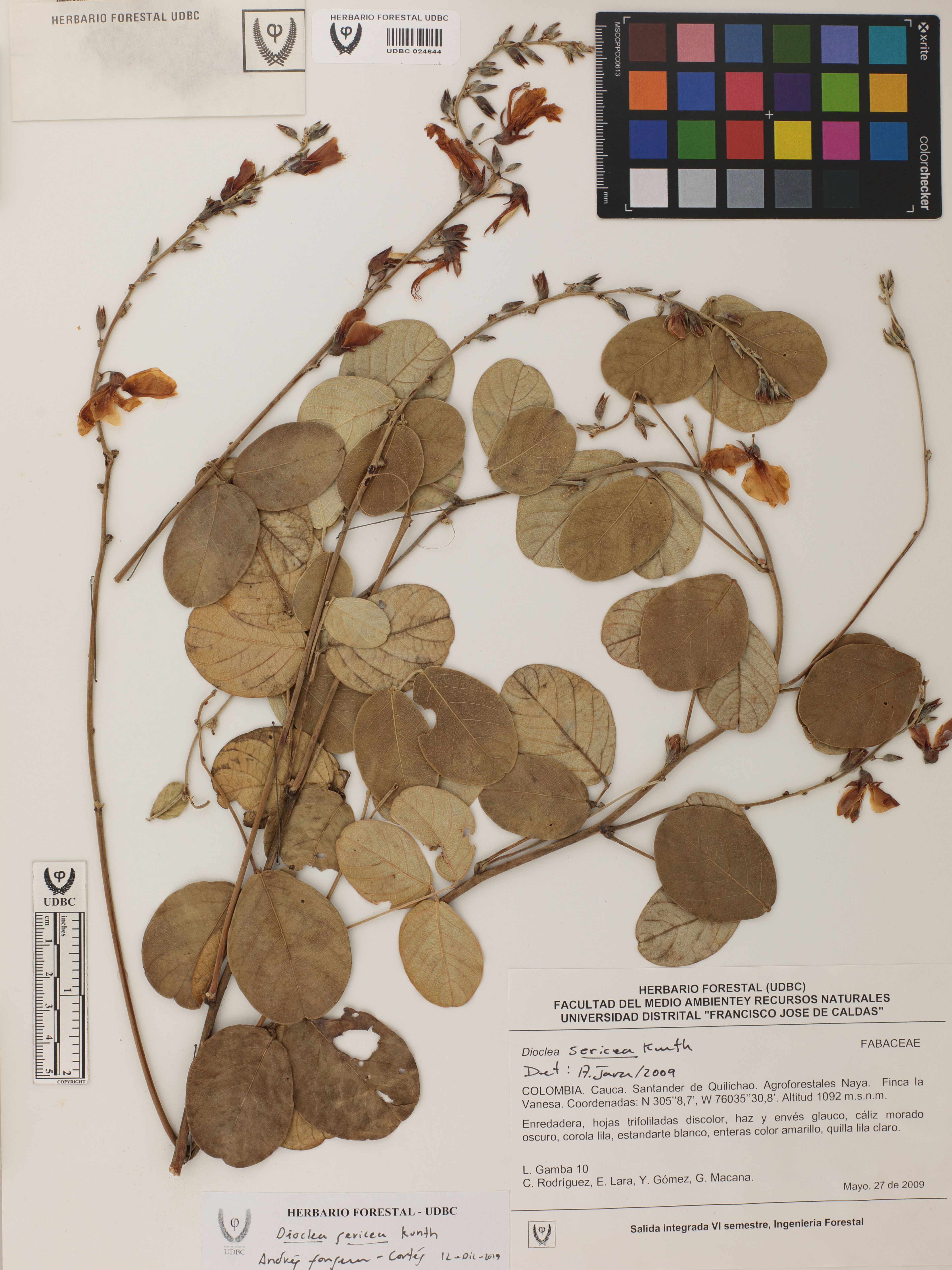 Fotografía del ejemplar Gamba, L. 10, determinado como Dioclea sericea en el año 2009