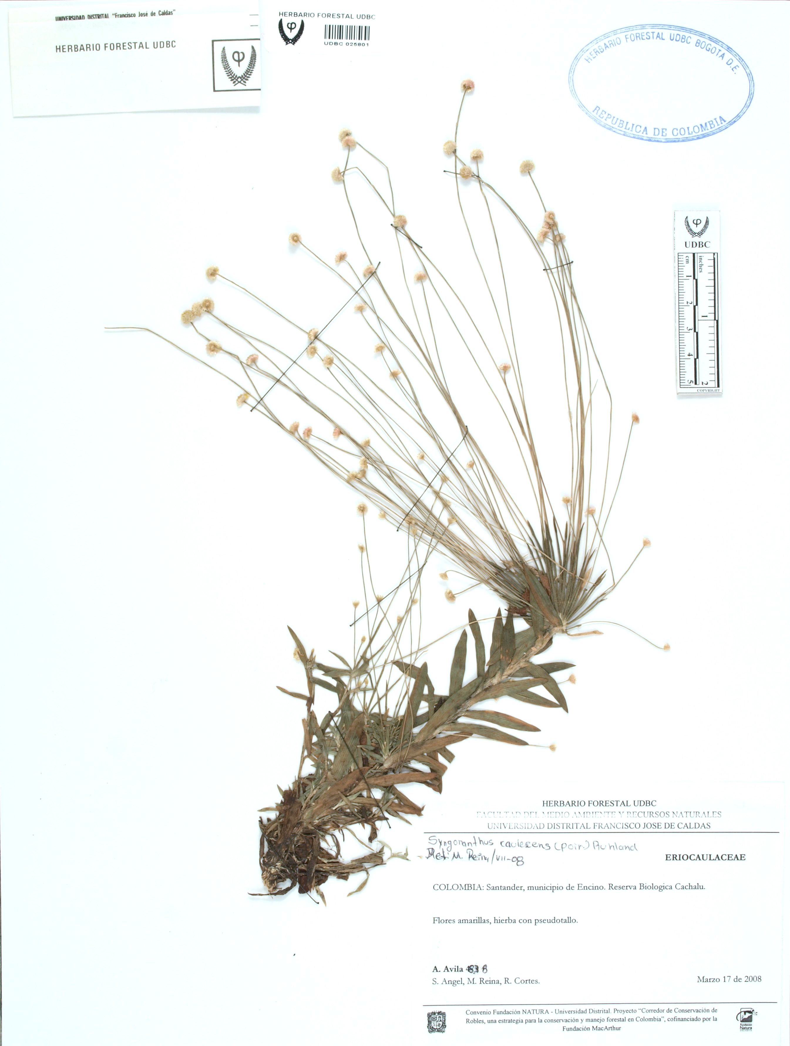 Fotografía del ejemplar Ávila, F., determinado como Syngonanthus caulescens en el año 2008