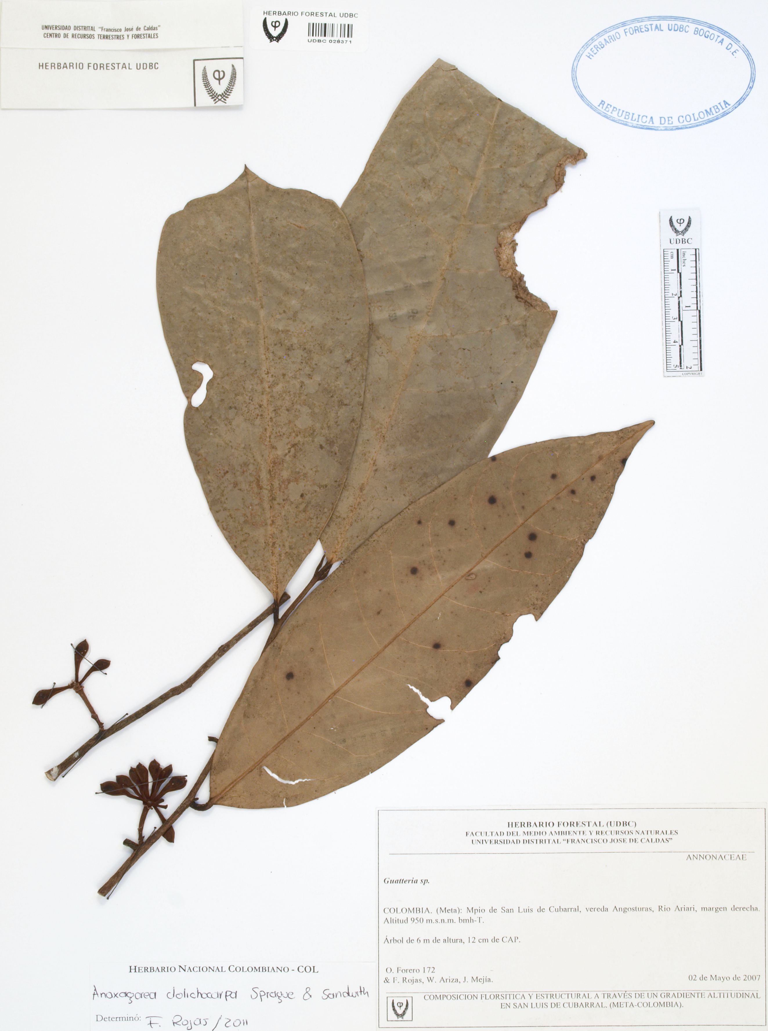 Fotografía del ejemplar Forero, O. 172, determinado como Anaxagorea dolichocarpa en el año 2011