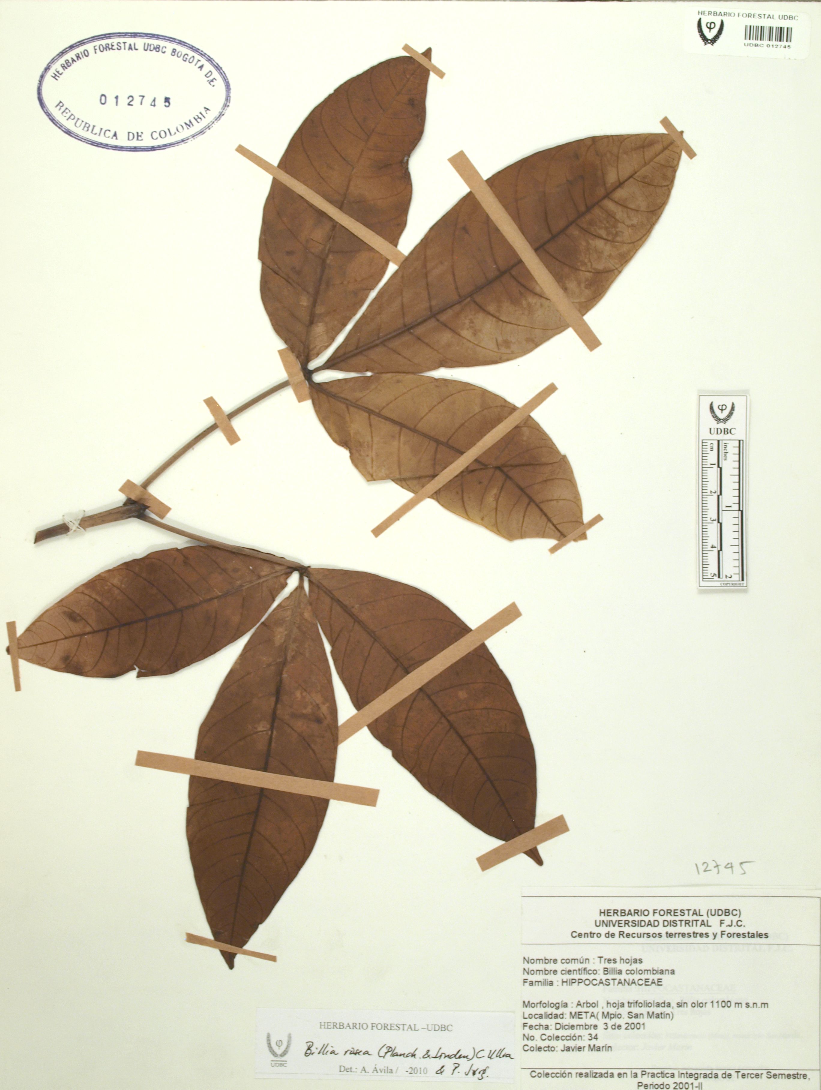 Fotografía del ejemplar Marín, J. 34, determinado como Billia rosea en el año 2010