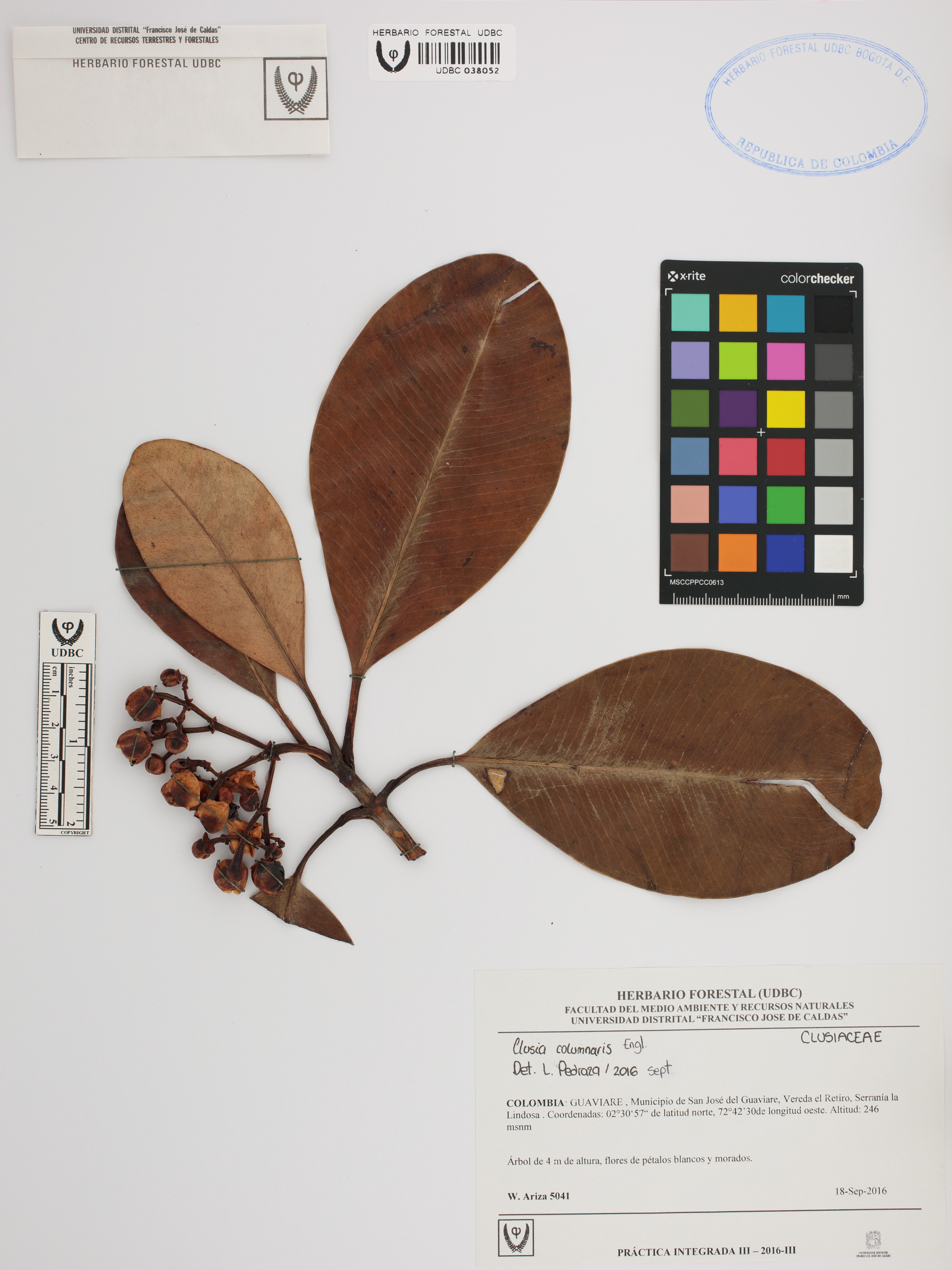 Fotografía del ejemplar Ariza, W. 5041, determinado como Clusia columnaris en el año 2016