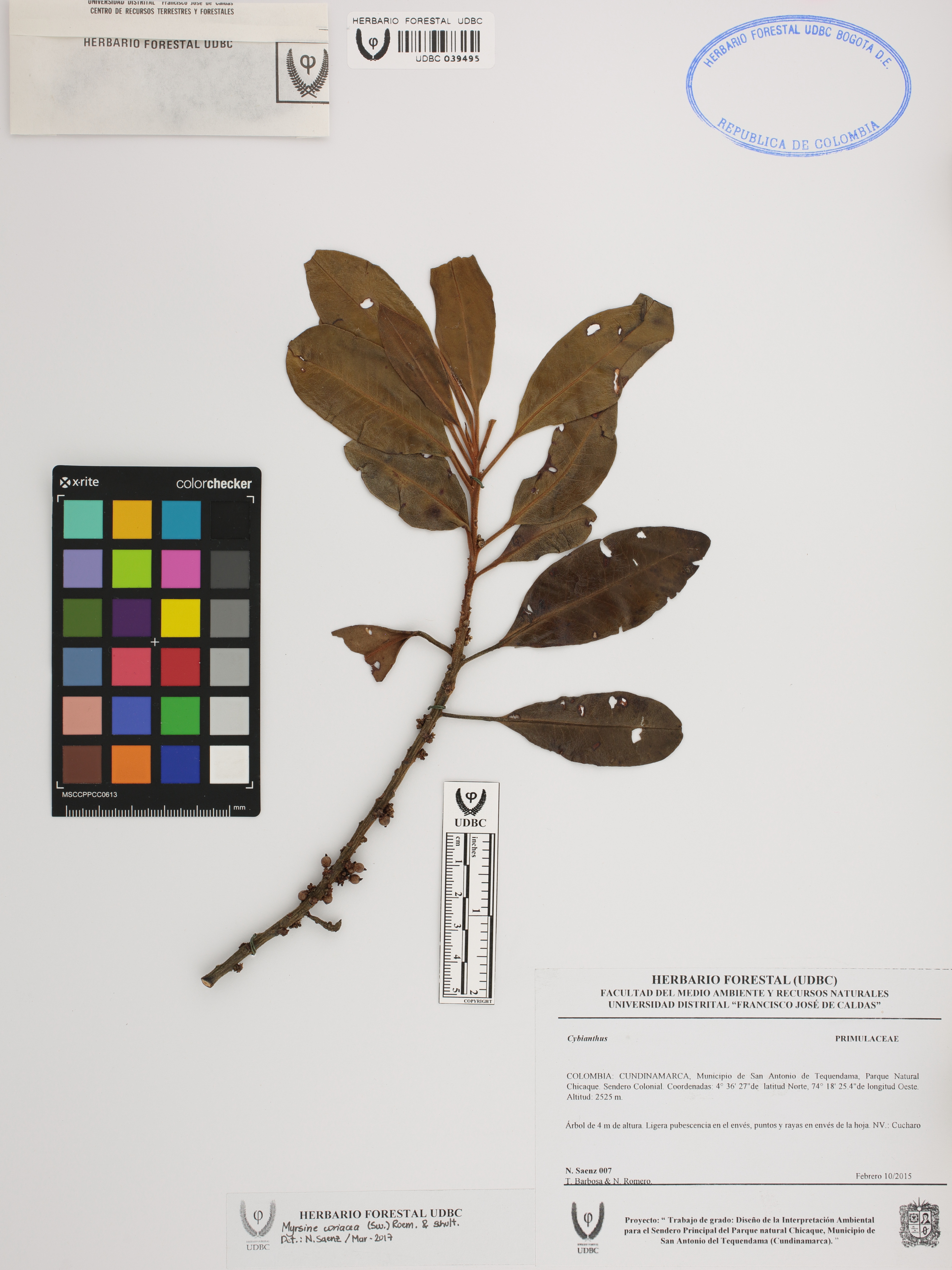 Fotografía del ejemplar Sáenz, N. 7, determinado como Myrsine coriacea en el año 2017