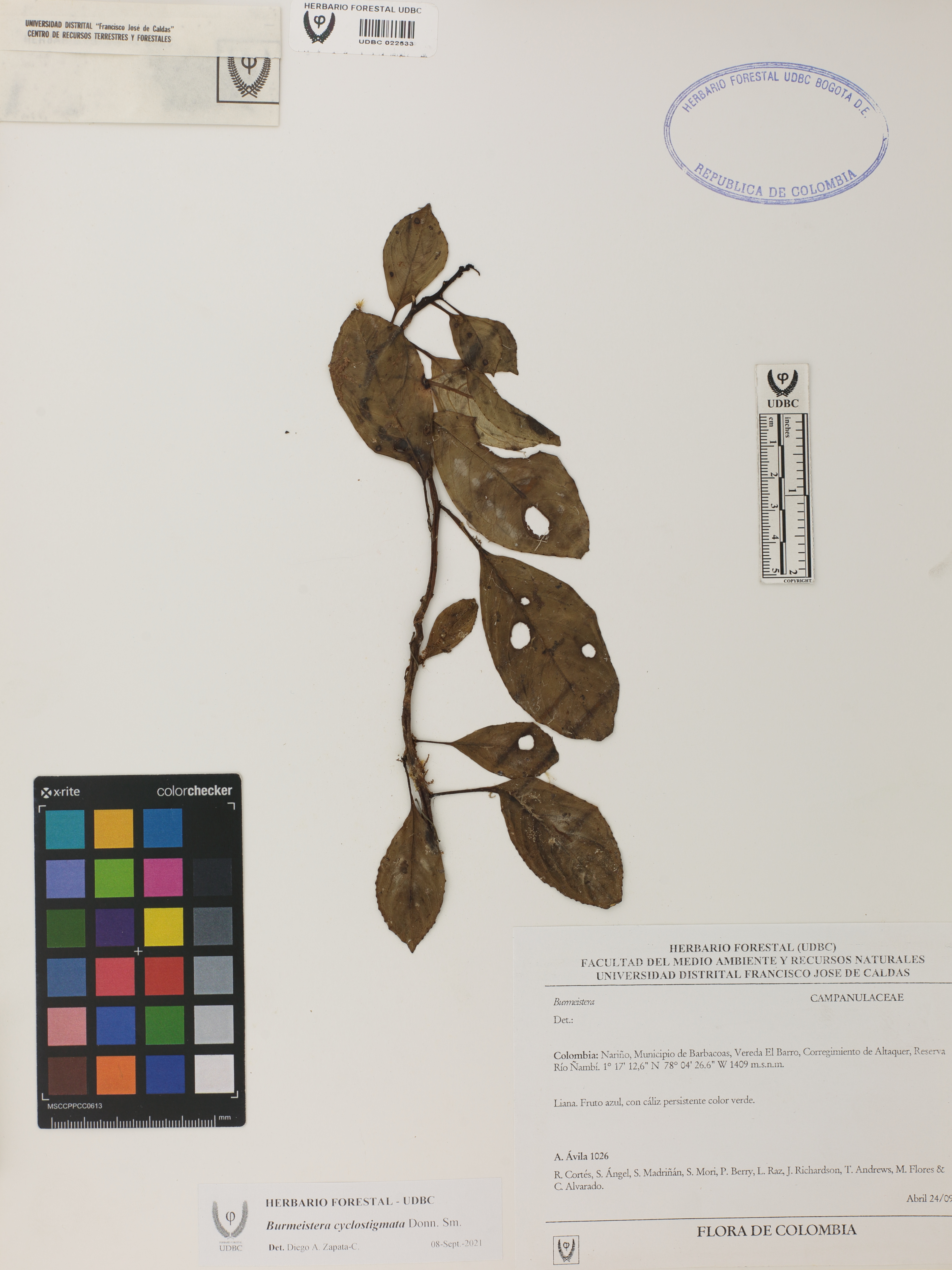 Fotografía del ejemplar Ávila, A. 1026, determinado como Burmeistera cyclostigmata en el año 2021
