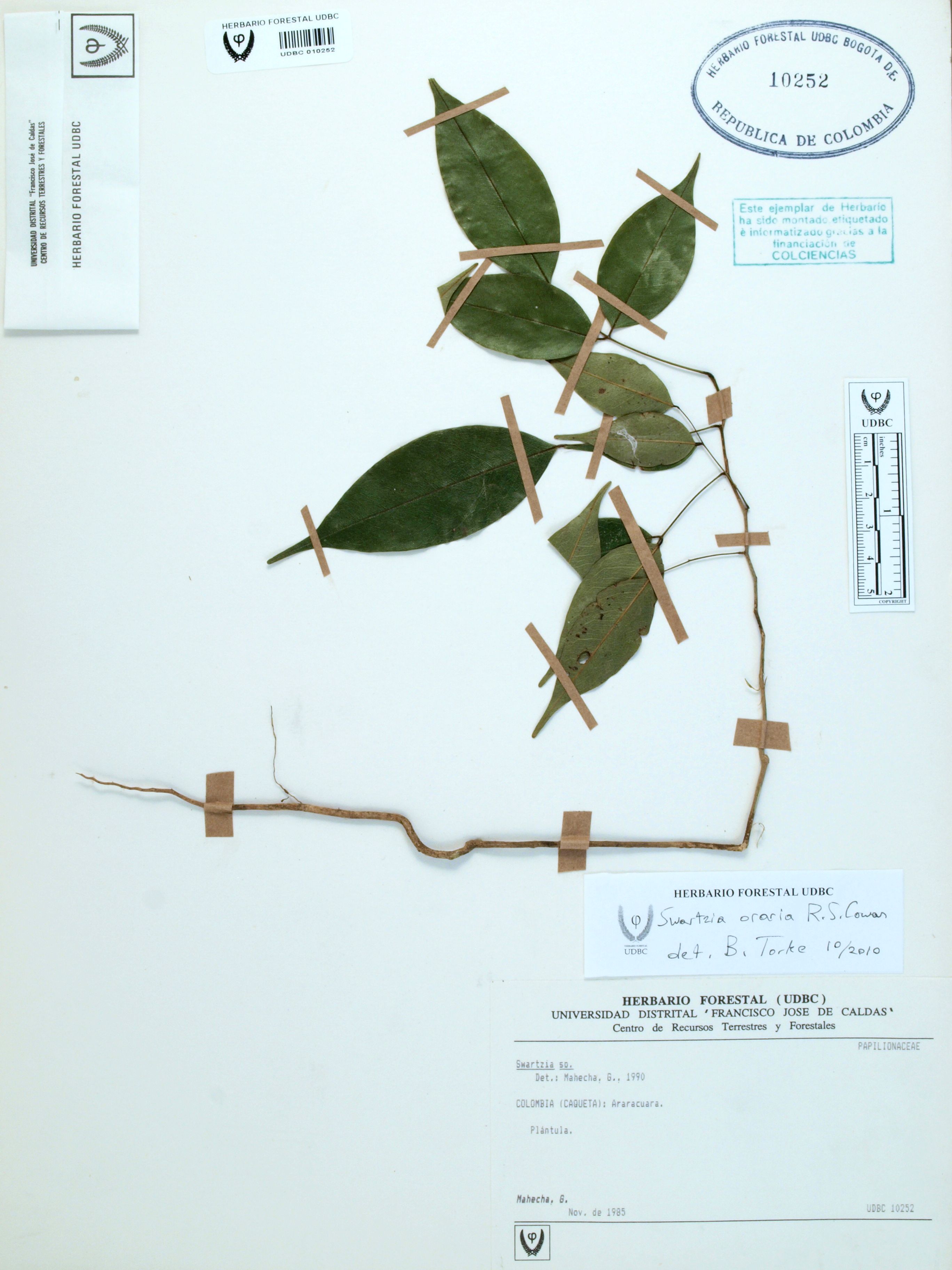 Fotografía del ejemplar Mahecha, G., determinado como Swartzia sp. en el año 1990