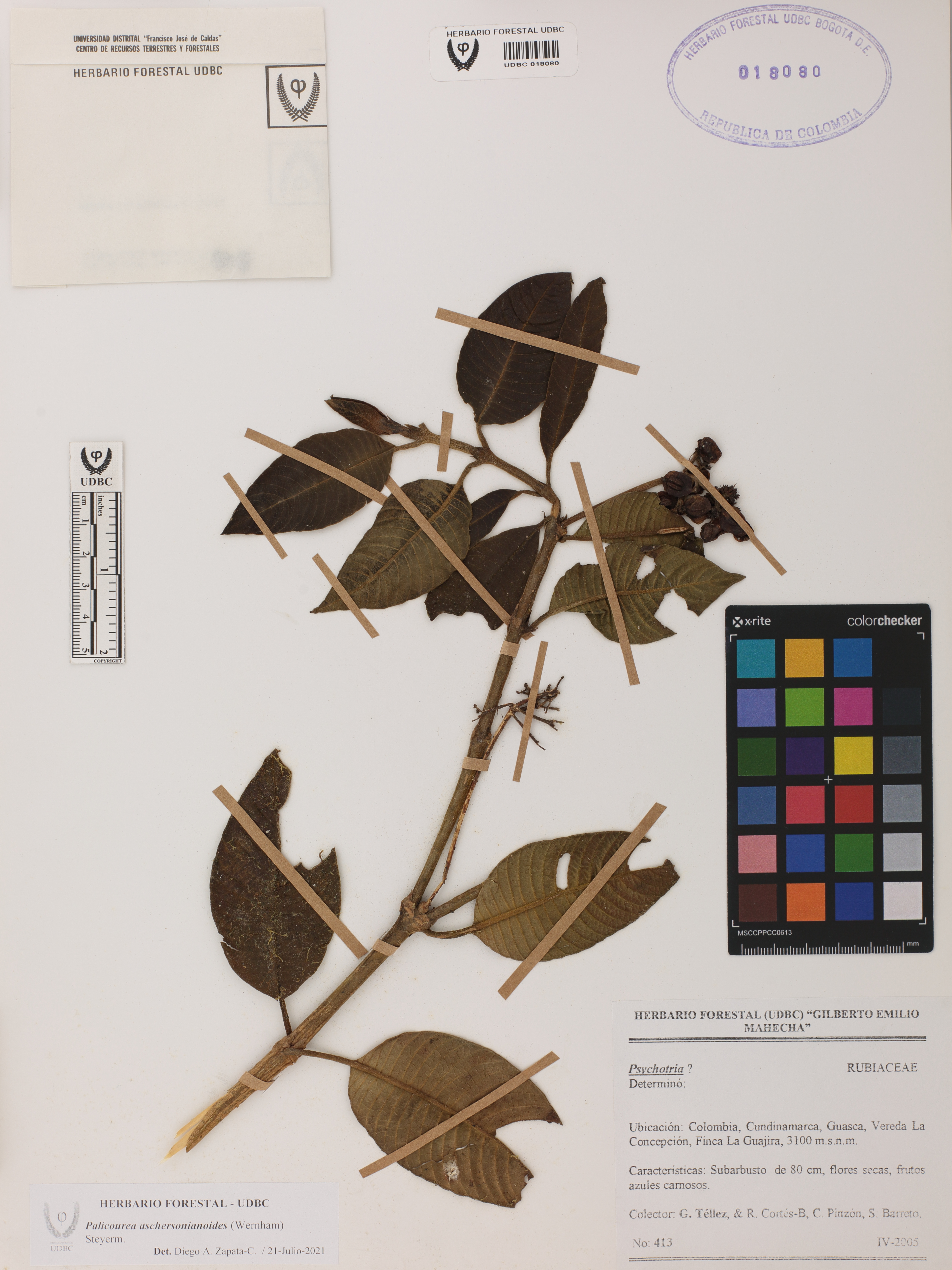 Fotografía del ejemplar Téllez, G. 413, determinado como Palicourea aschersonianoides en el año 2021