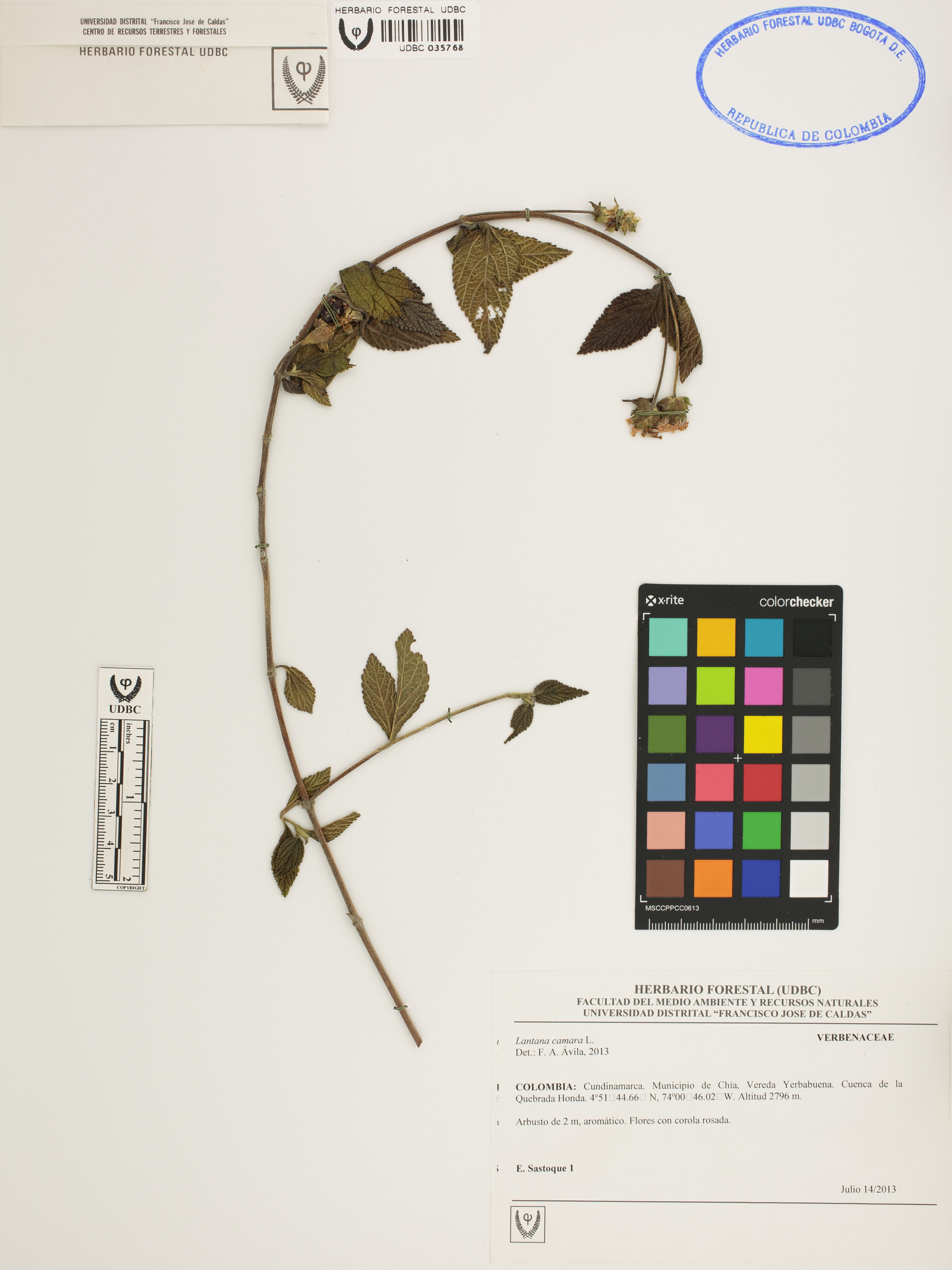 Fotografía del ejemplar Sastoque, E. 1, determinado como Lantana camara en el año 2013
