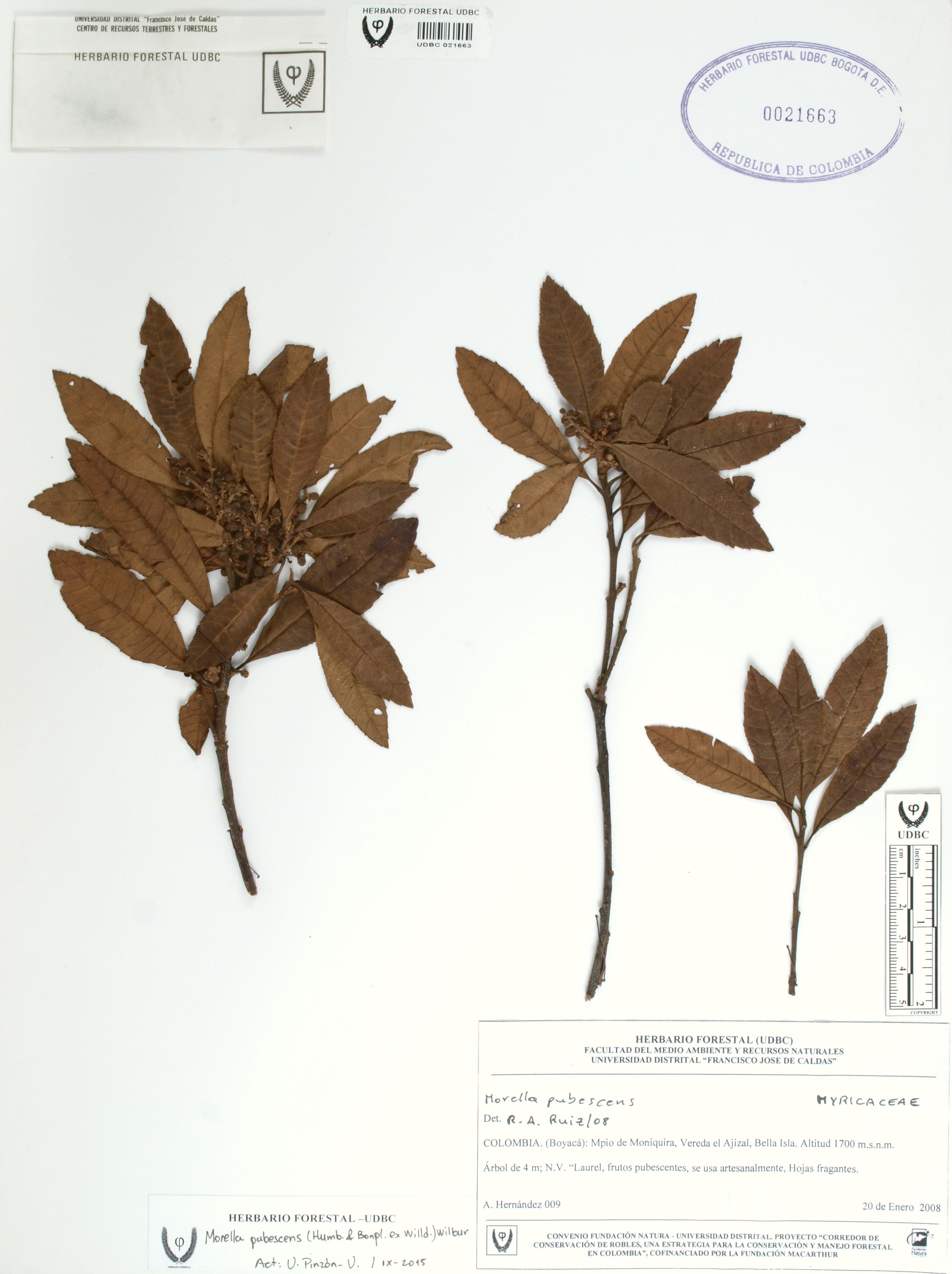 Fotografía del ejemplar Hernández, A. 9, determinado como Morella pubescens en el año 2015