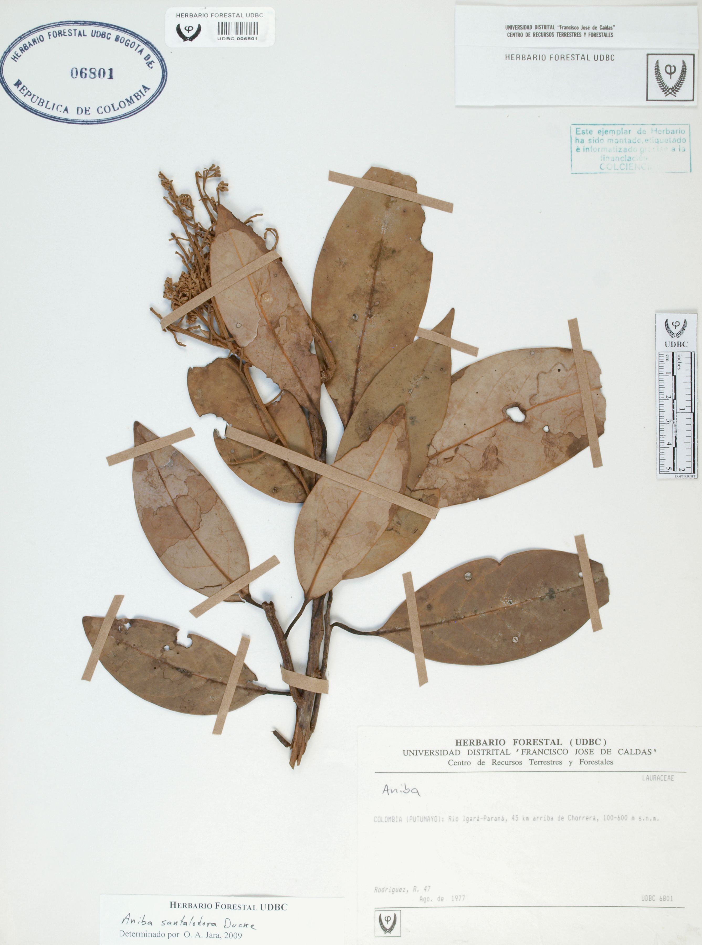 Fotografía del ejemplar Rodríguez, R. 47, determinado como Aniba santalodora en el año 2009
