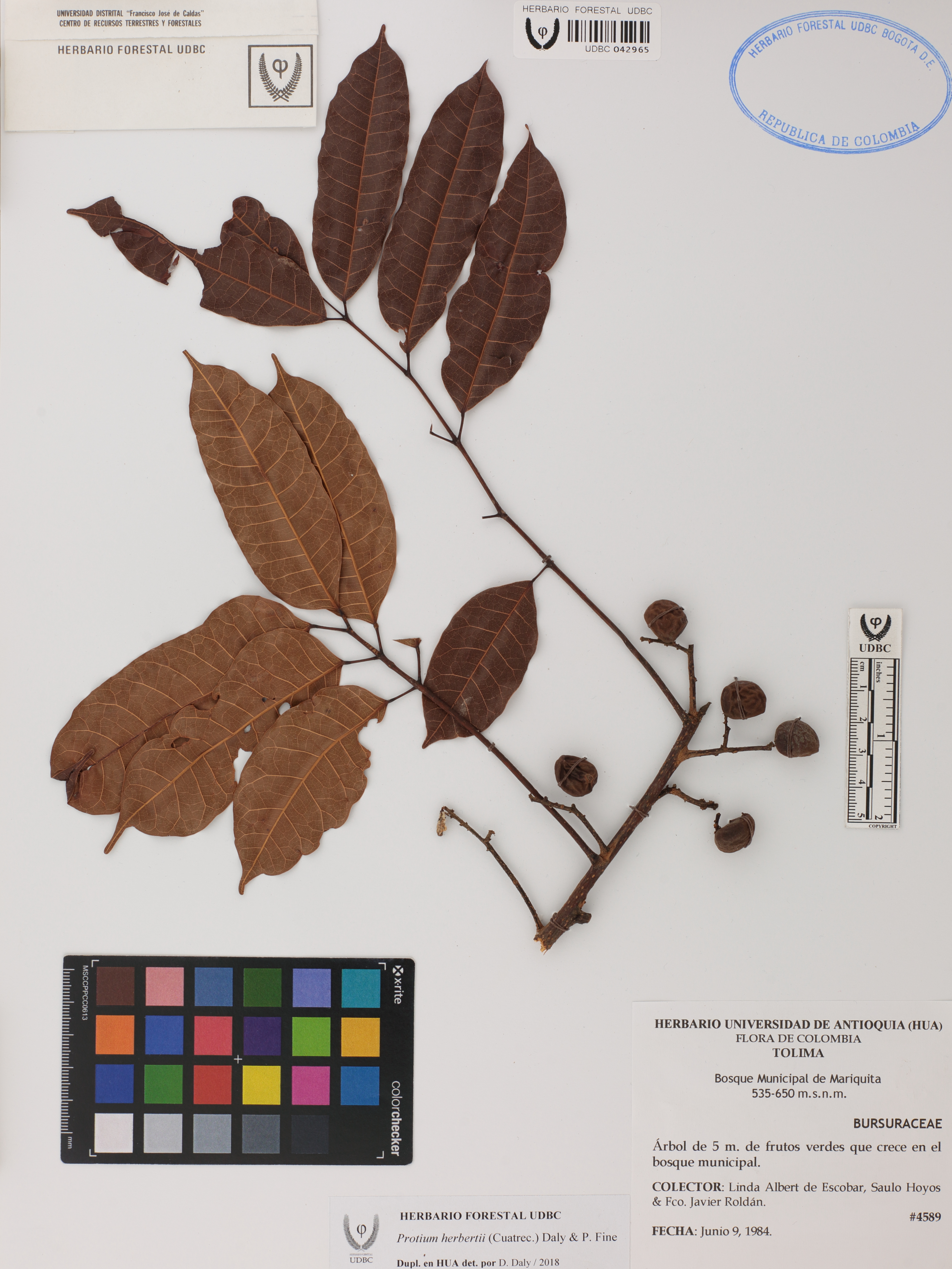 Fotografía del ejemplar Albert de Escobar, L. 4589, determinado como Protium herbertii en el año 2018