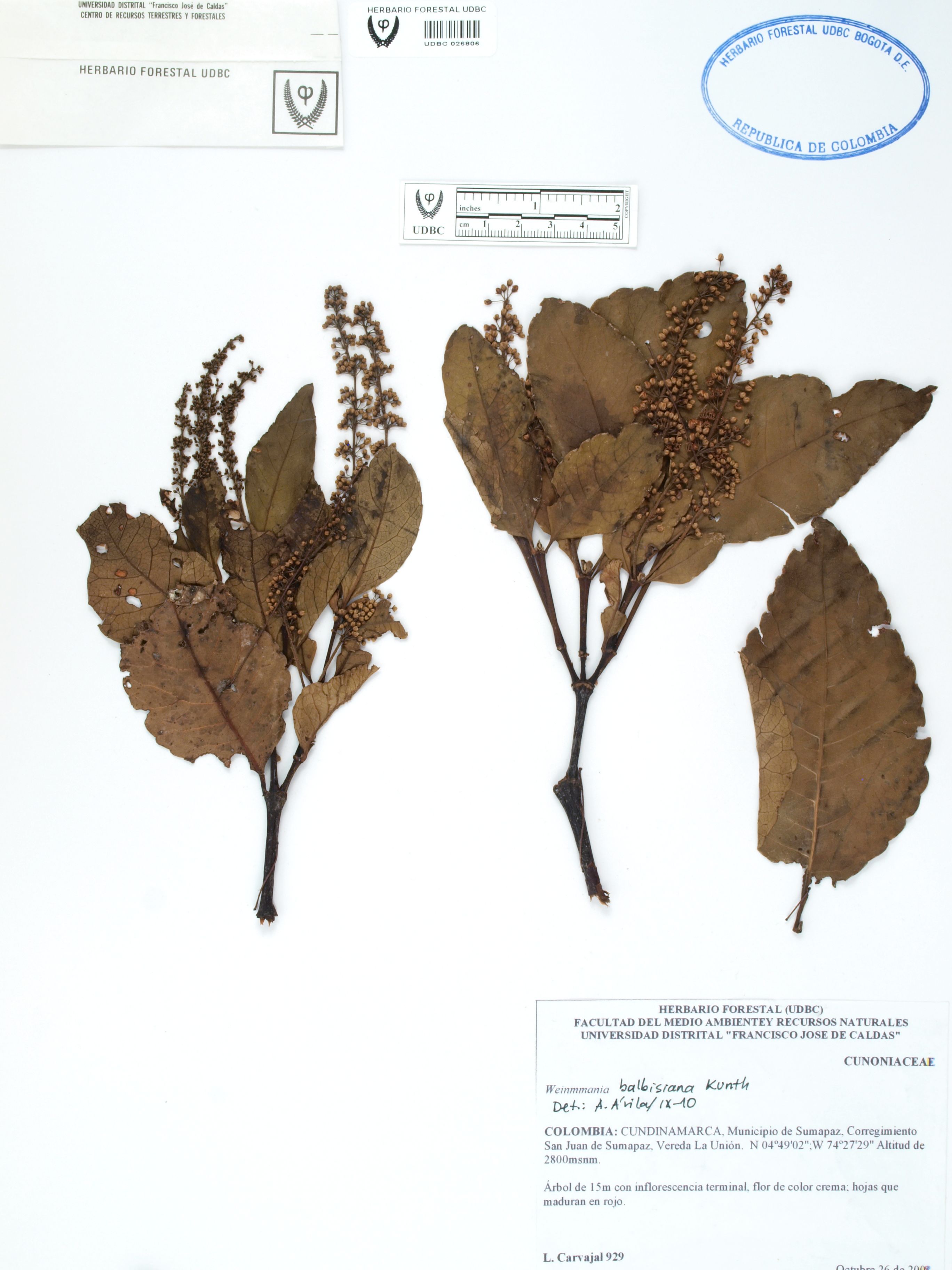 Fotografía del ejemplar Carvajal, L. 929, determinado como Weinmannia balbisiana en el año 2010