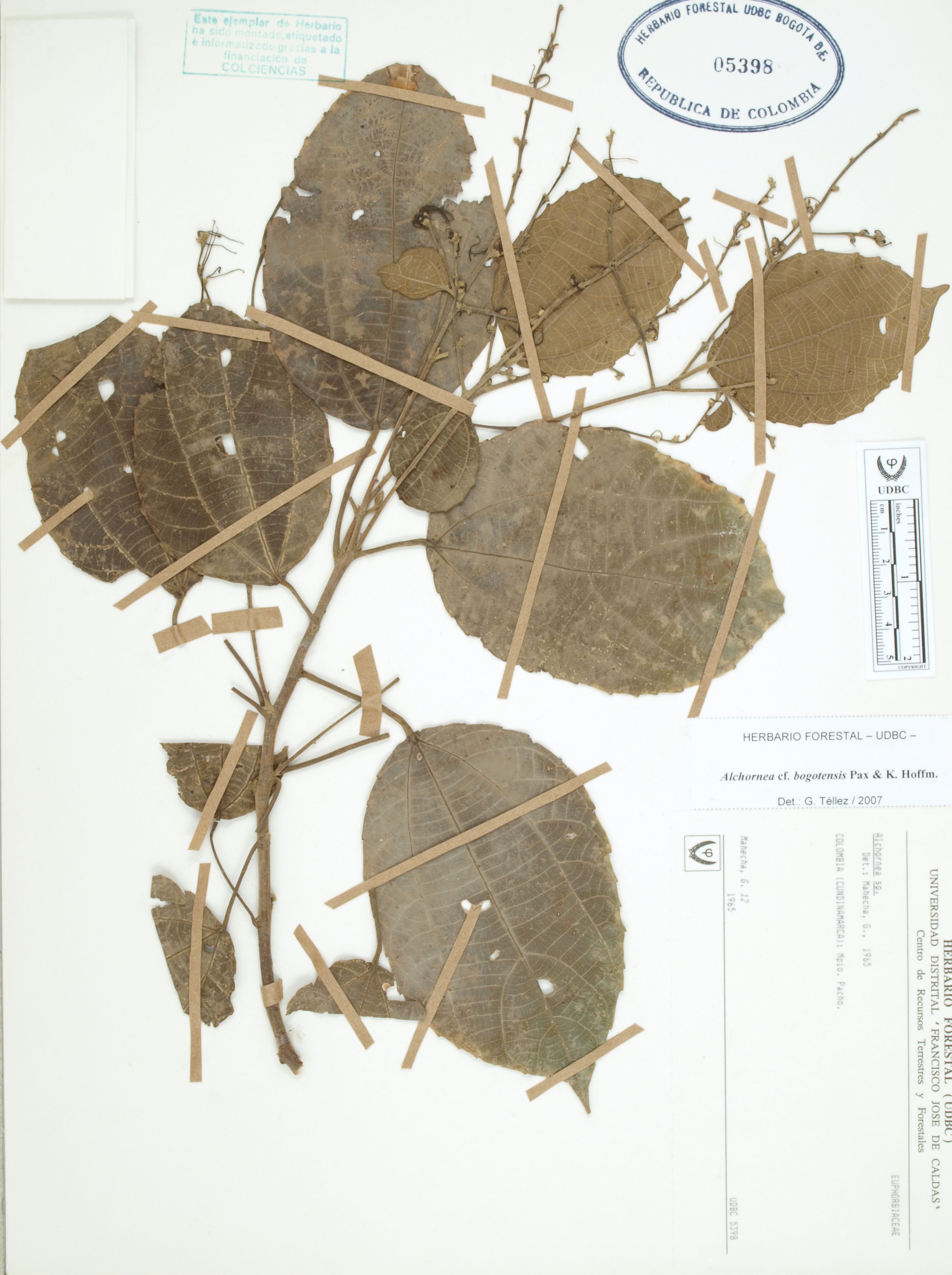 Fotografía del ejemplar Mahecha, G. 12, determinado como Alchornea bogotensis en el año 2007