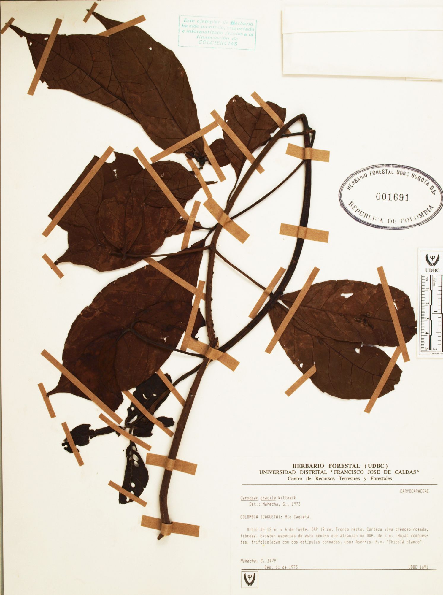 Fotografía del ejemplar Mahecha, G. 1479, determinado como Caryocar gracile en el año 1973