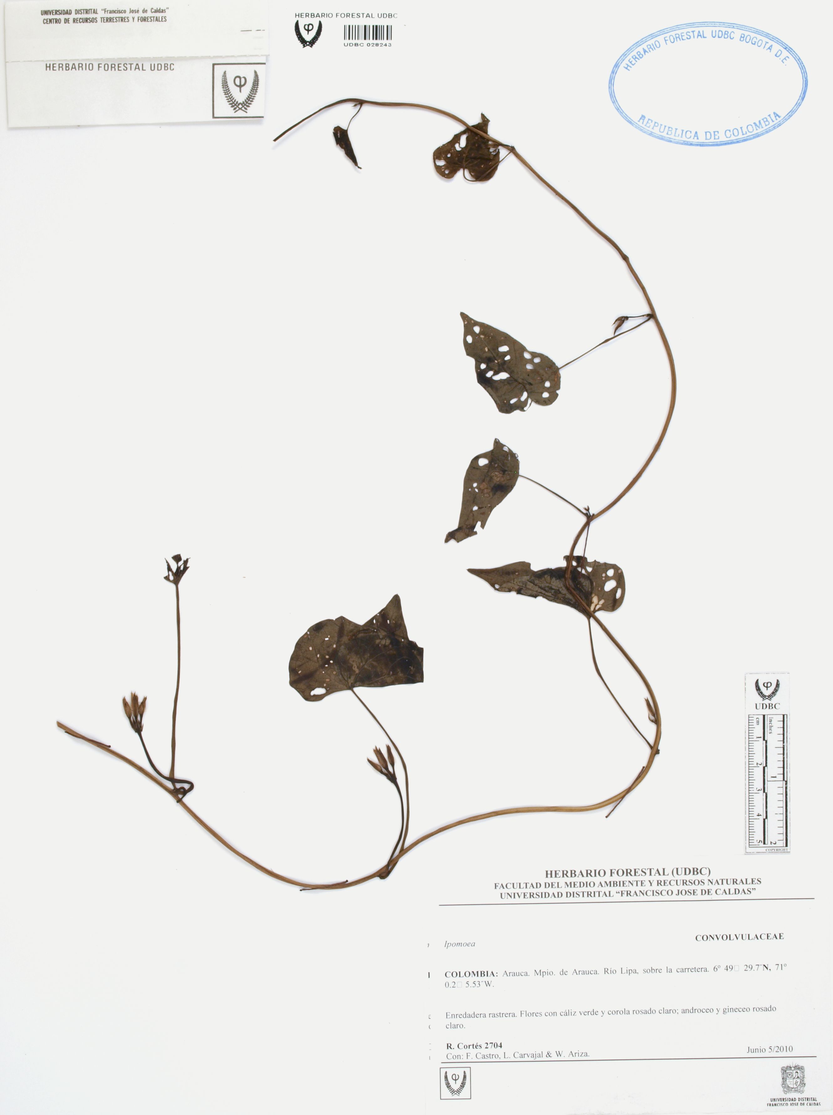 Fotografía del ejemplar Cortés-B., R. 2704, determinado como Ipomoea sp.
