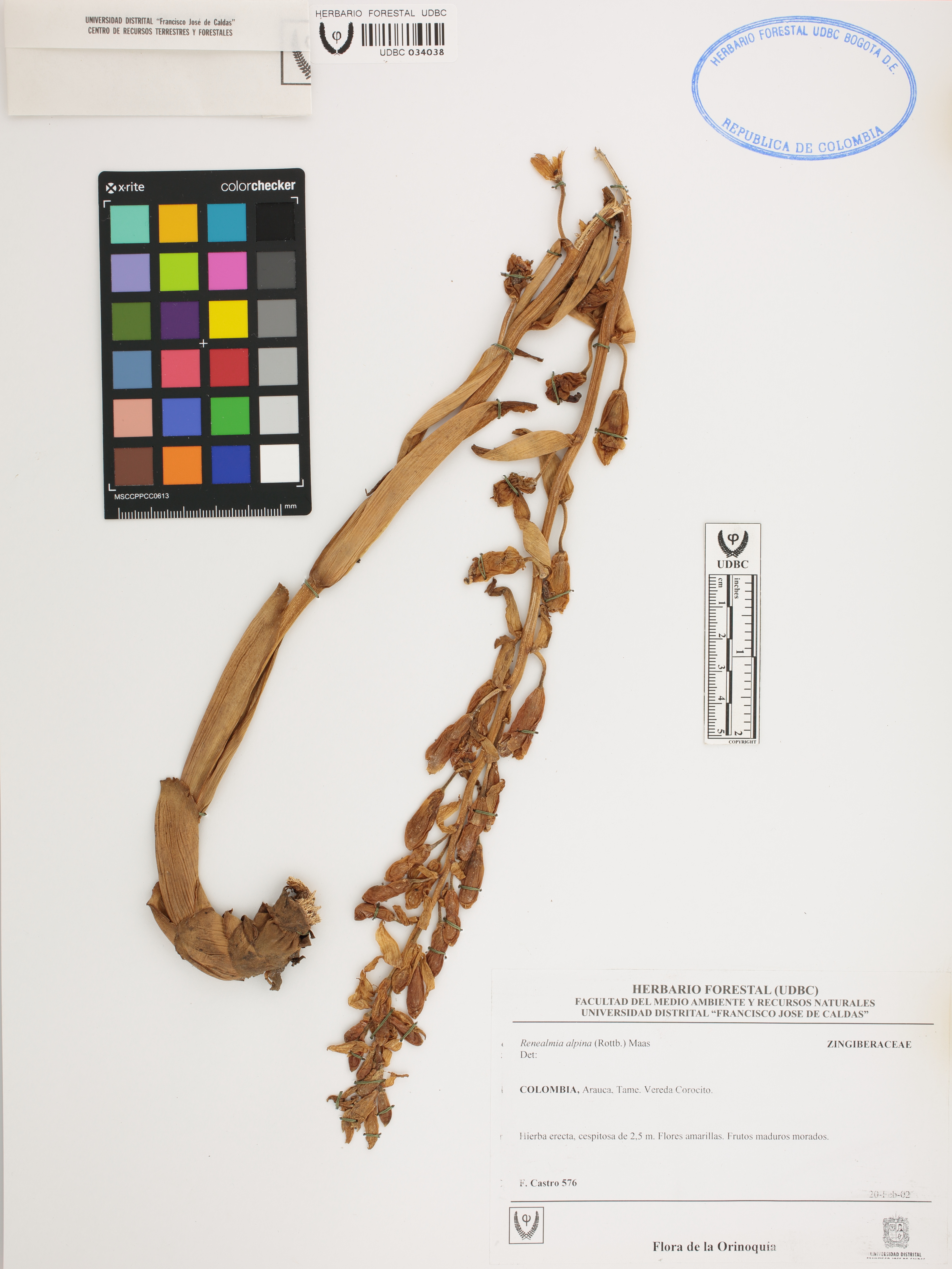 Fotografía del ejemplar Castro, F. 576, determinado como Renealmia alpinia