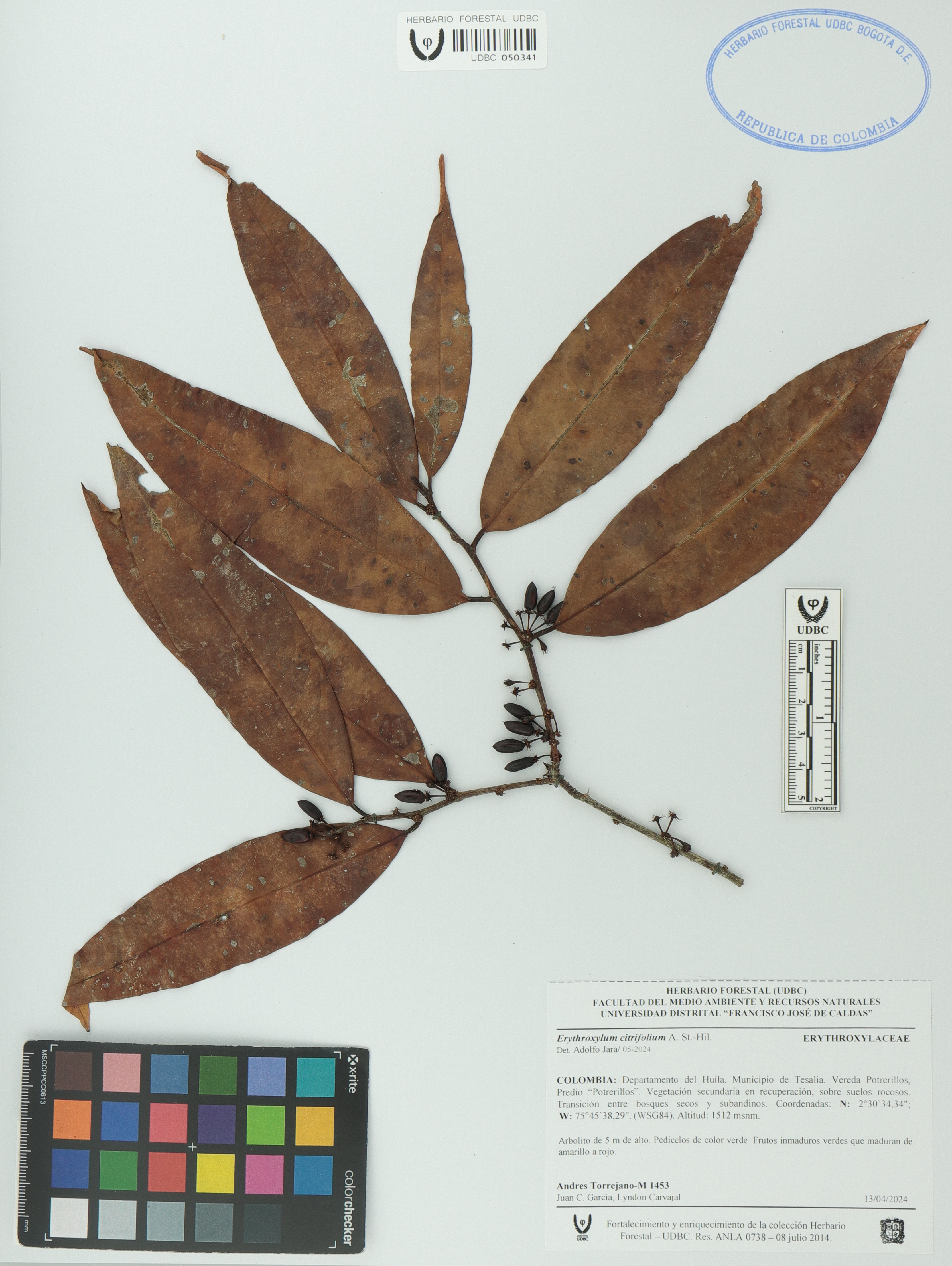 Fotografía del ejemplar Torrejano-M., A. 1453, determinado como Erythroxylum citrifolium en el año 2024
