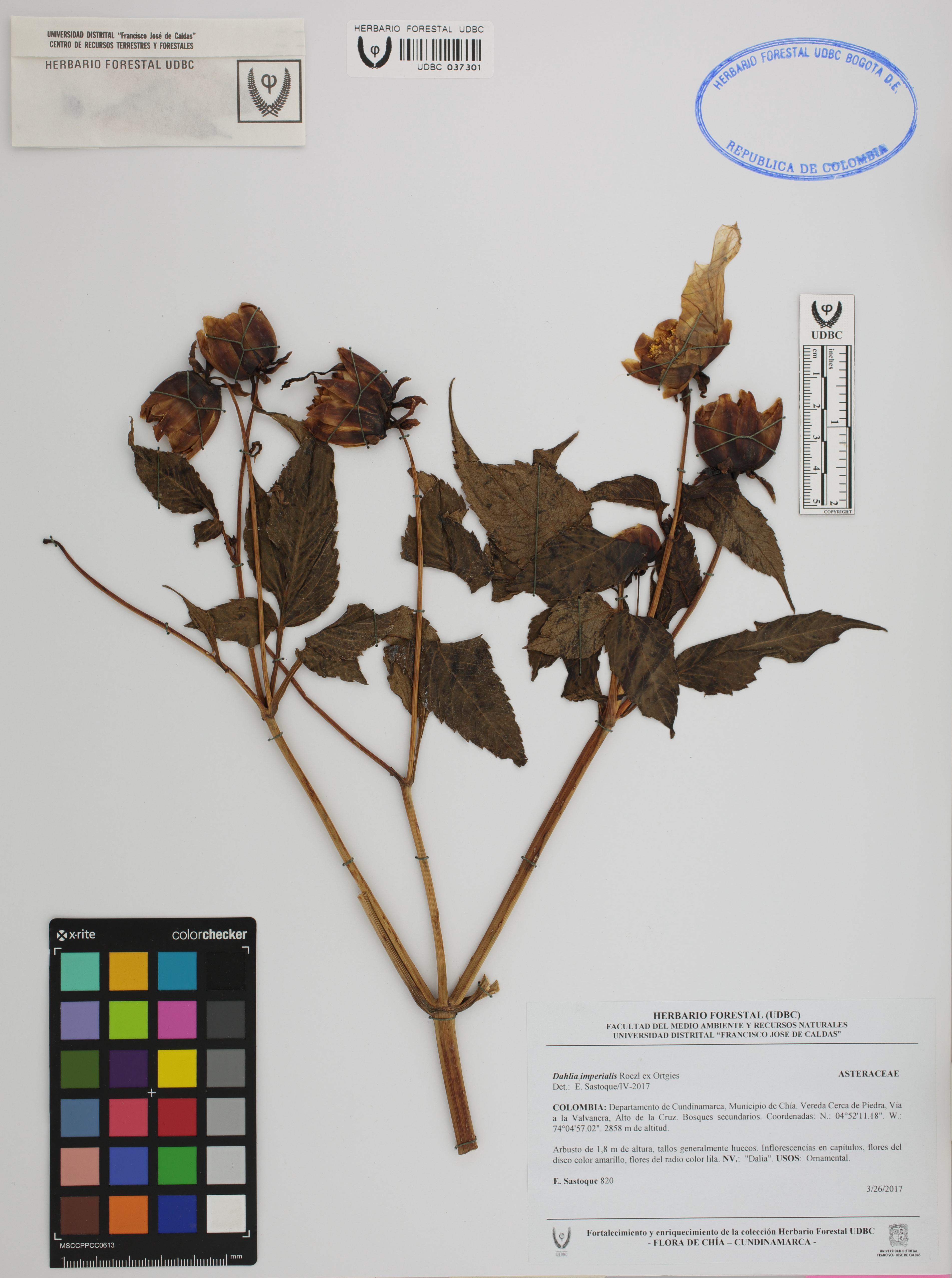 Fotografía del ejemplar Sastoque, E. 820, determinado como Dahlia imperialis en el año 2017