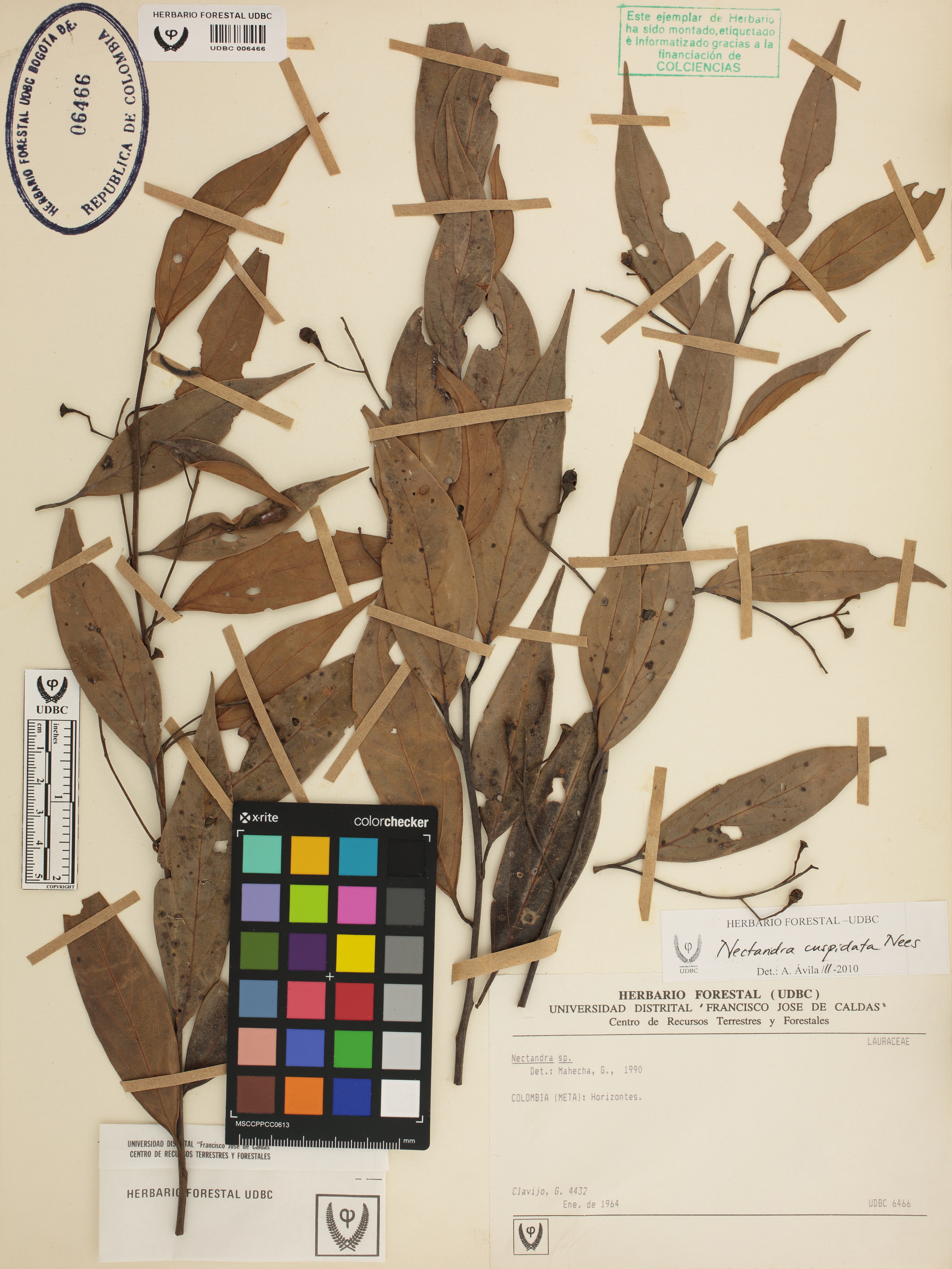 Fotografía del ejemplar Clavijo, G. 4432, determinado como Nectandra cuspidata en el año 2010
