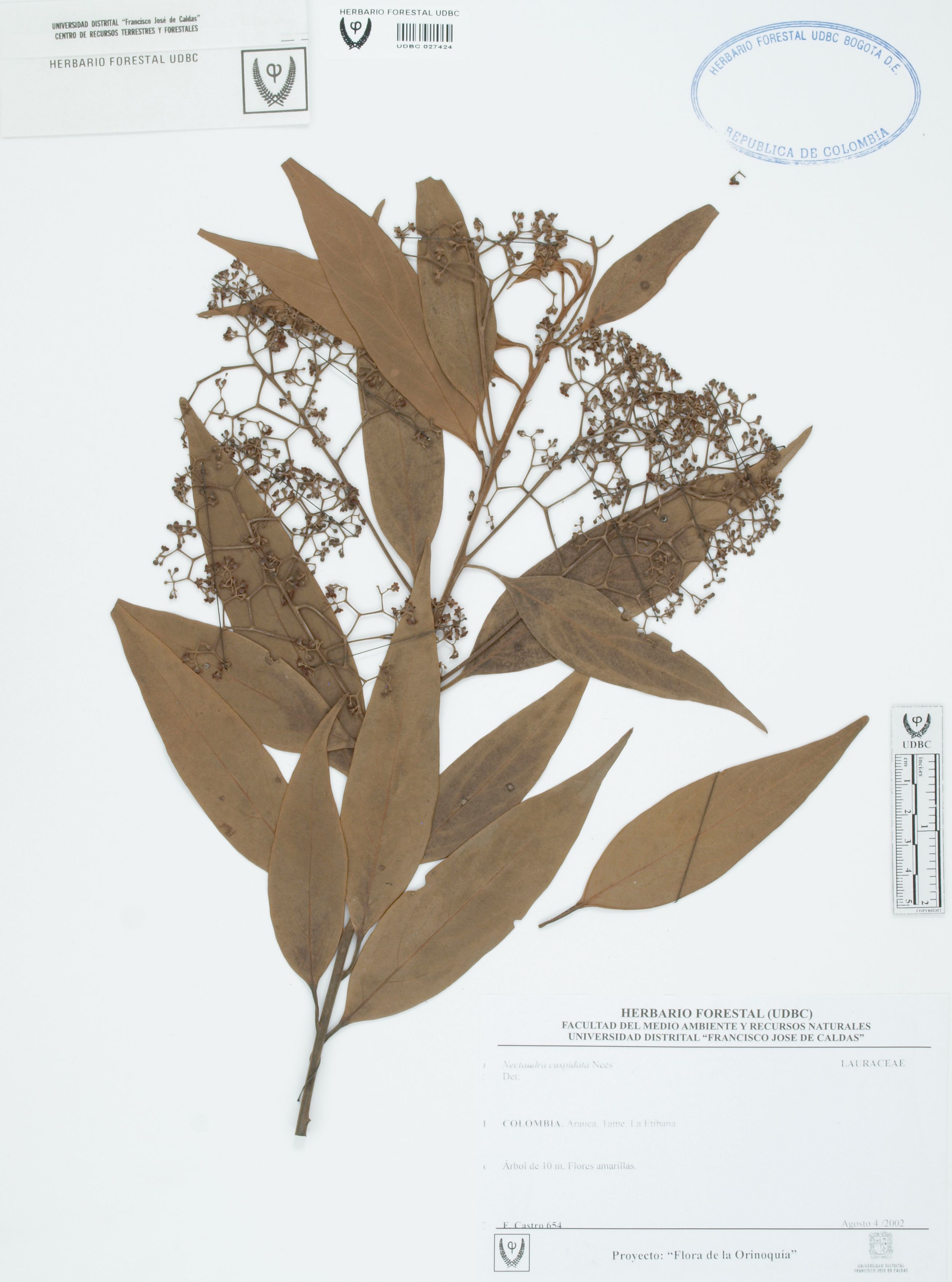 Fotografía del ejemplar Castro, F. 654, determinado como Nectandra cuspidata