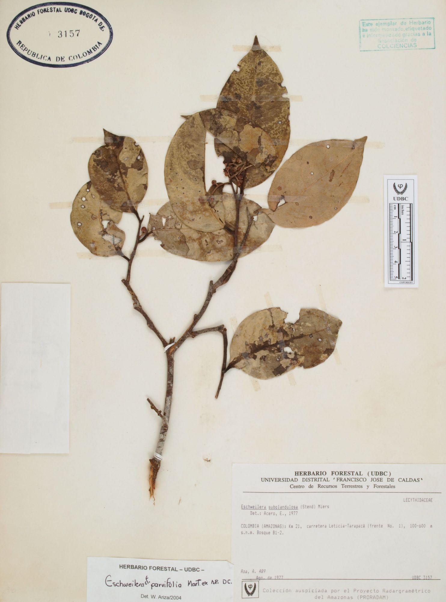 Fotografía del ejemplar Roa, A. 489, determinado como Eschweilera parvifolia en el año 2004