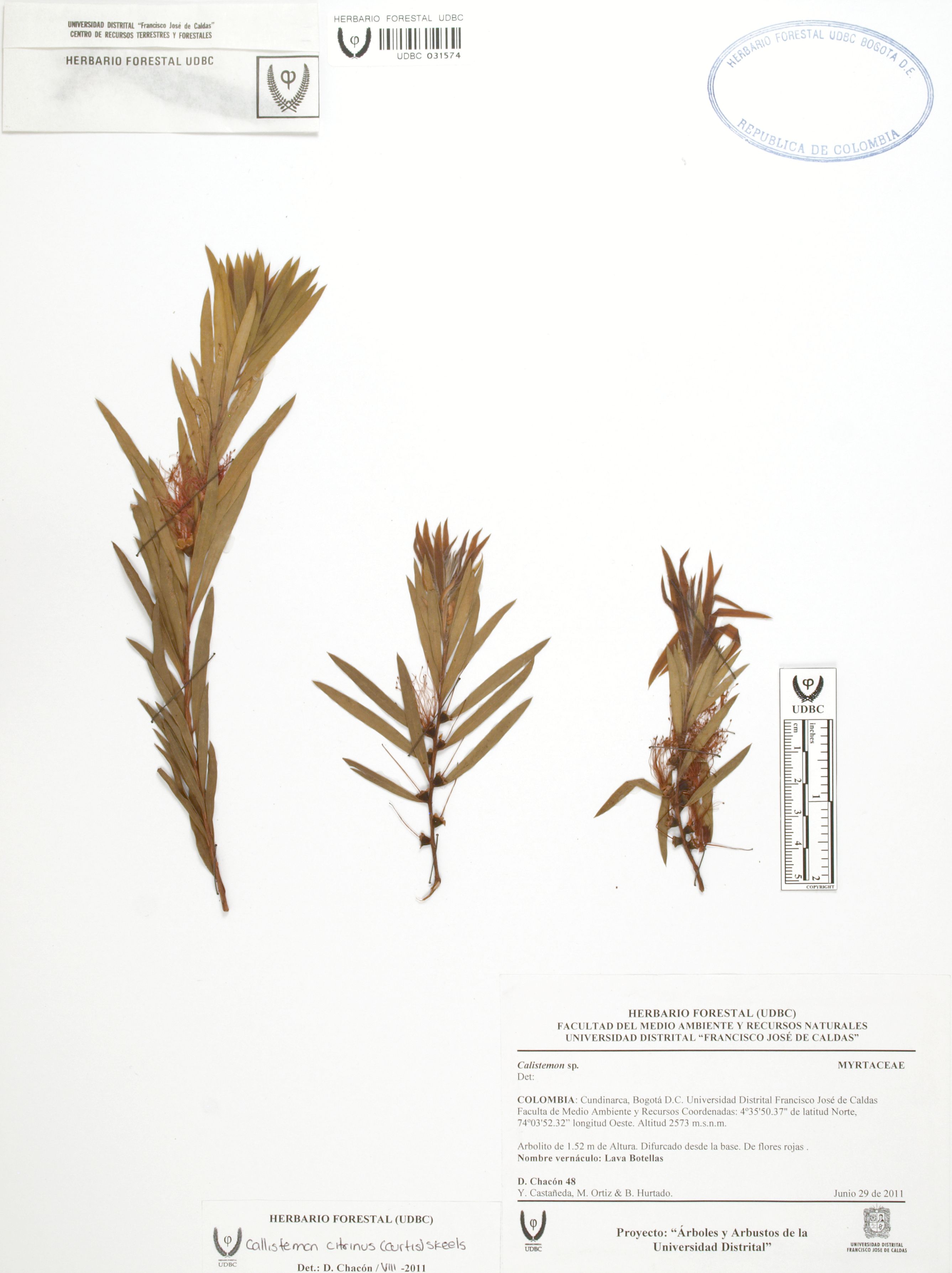 Fotografía del ejemplar Chacón, D. 48, determinado como Callistemon citrinus en el año 2011
