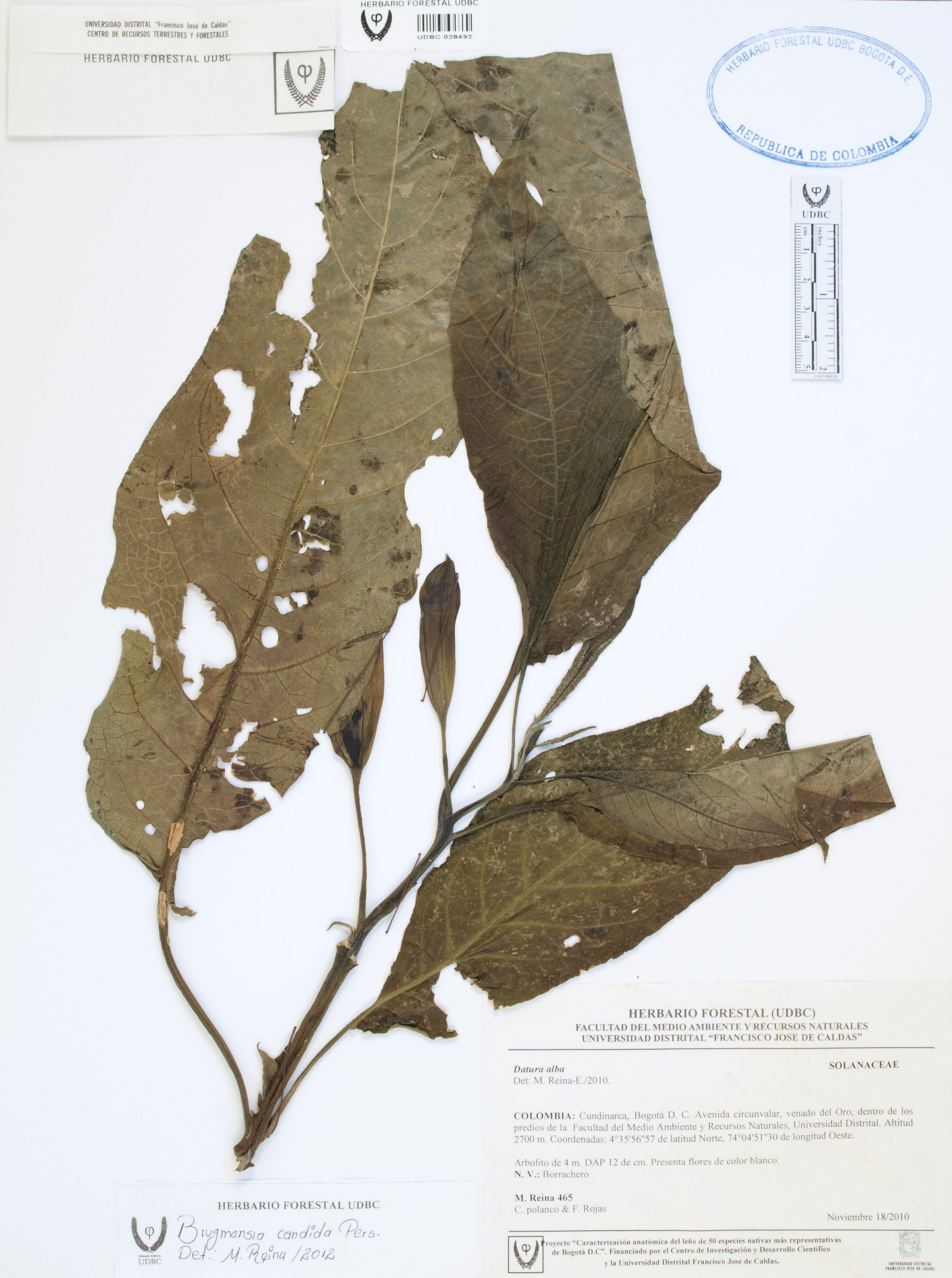 Fotografía del ejemplar Reina, M. 465, determinado como Brugmansia × candida en el año 2012