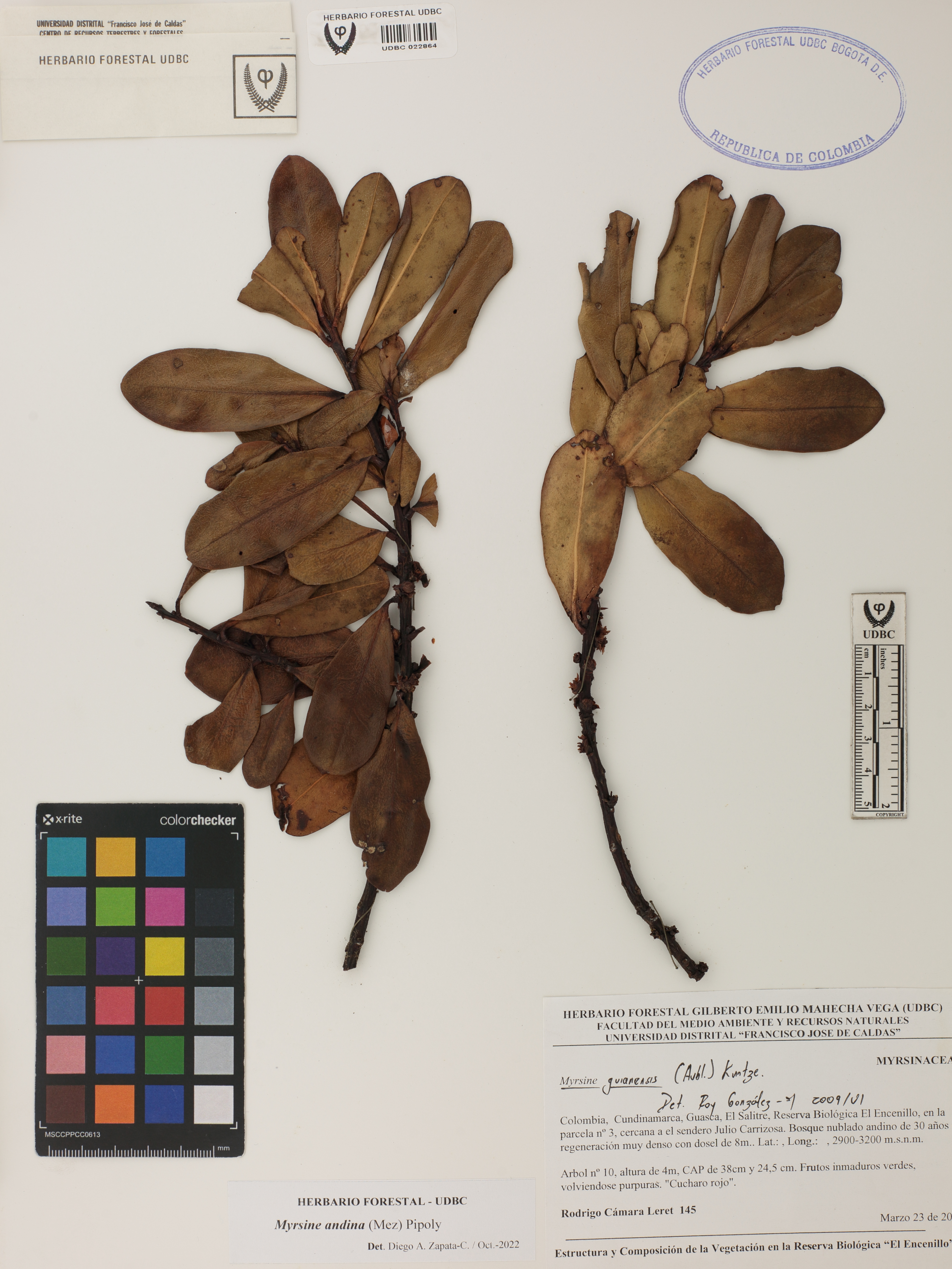 Fotografía del ejemplar Cámara, R. 145, determinado como Myrsine andina en el año 2022