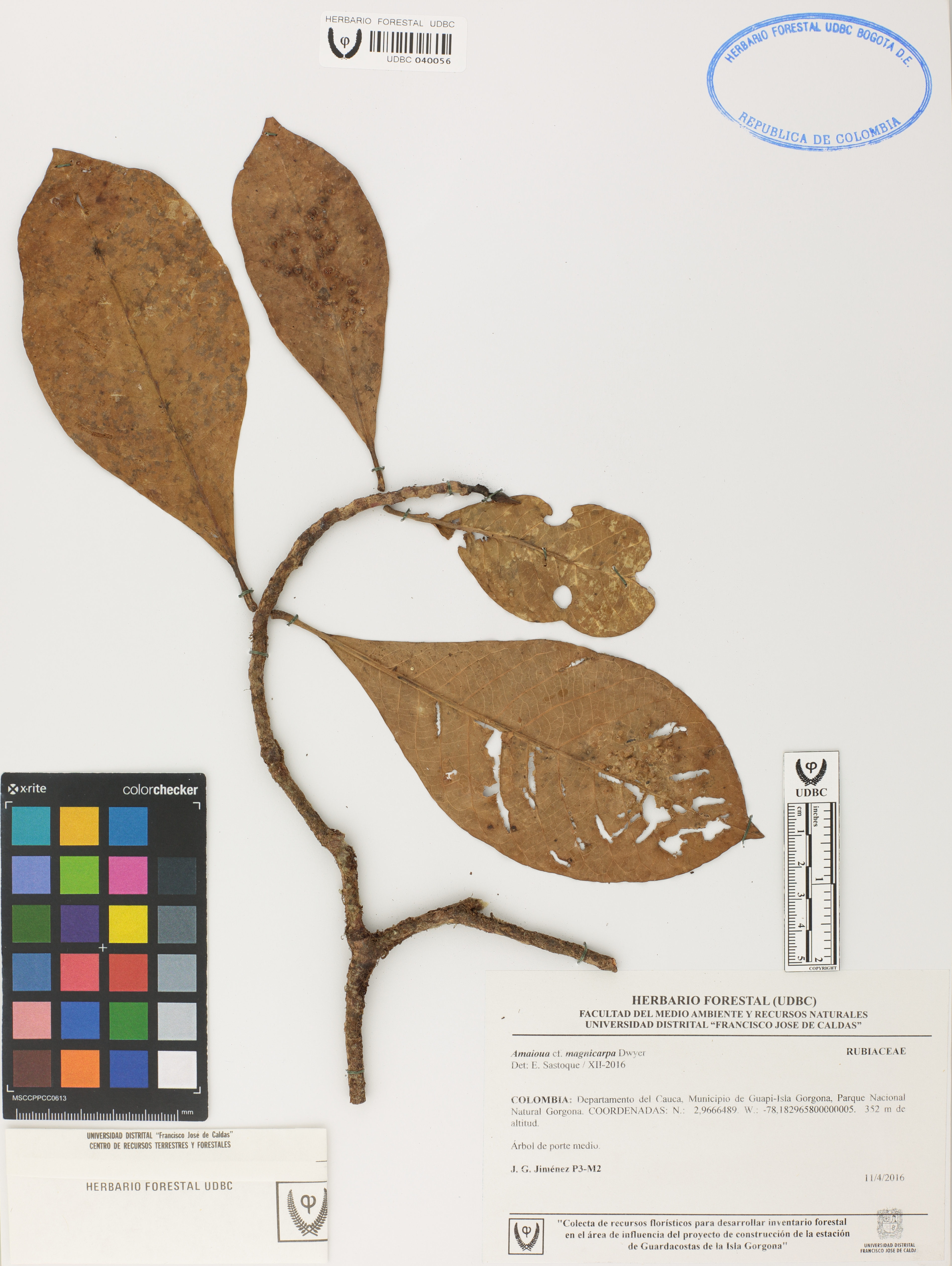 Fotografía del ejemplar Jiménez, J., determinado como Amaioua magnicarpa en el año 2016