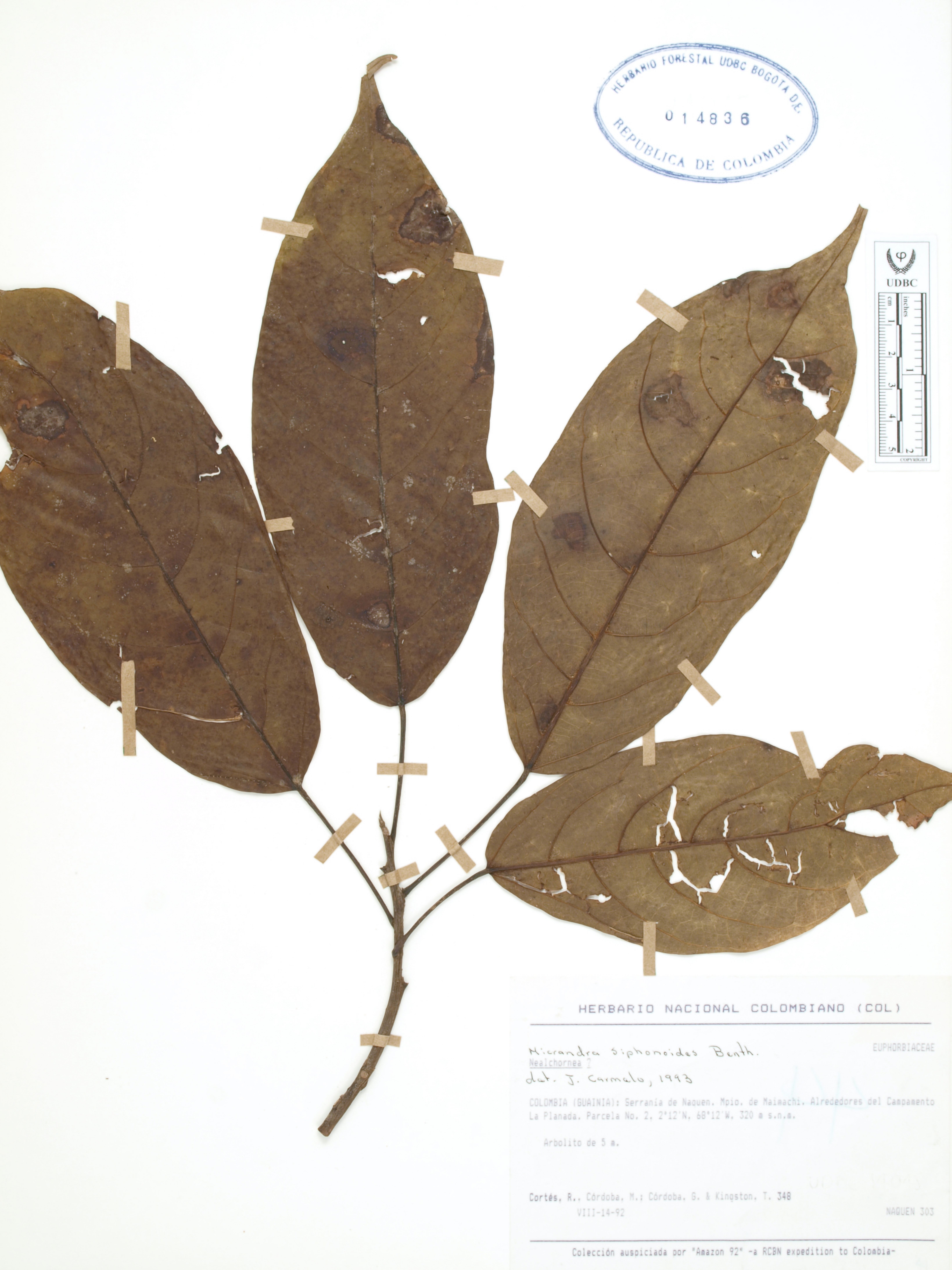 | dc.description | Fotografía del ejemplar Cortés-B., R. 348, determinado como Micrandra siphonioides en el año 1993 | |