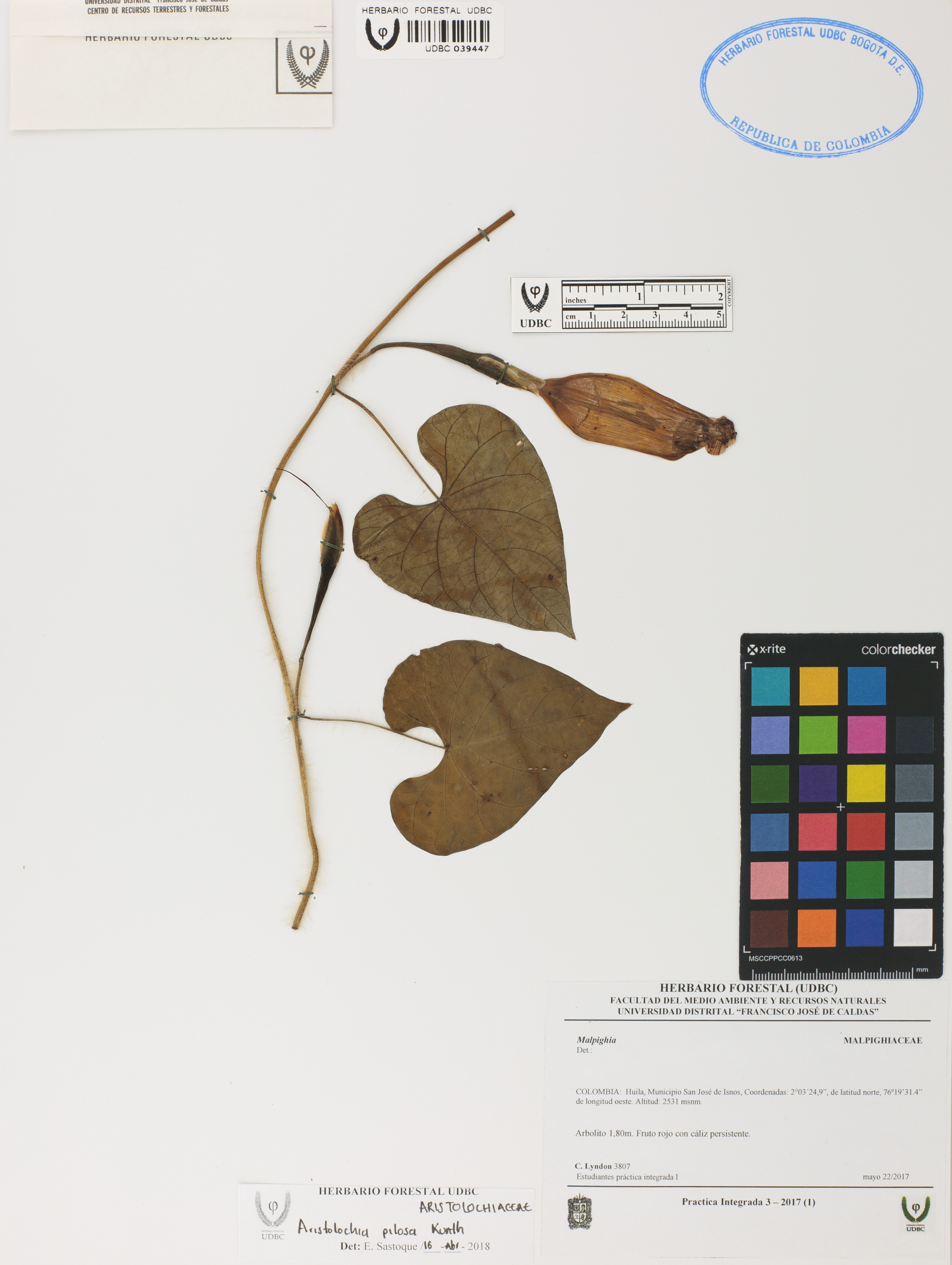 Fotografía del ejemplar Carvajal, L. 3807, determinado como Aristolochia pilosa en el año 2018