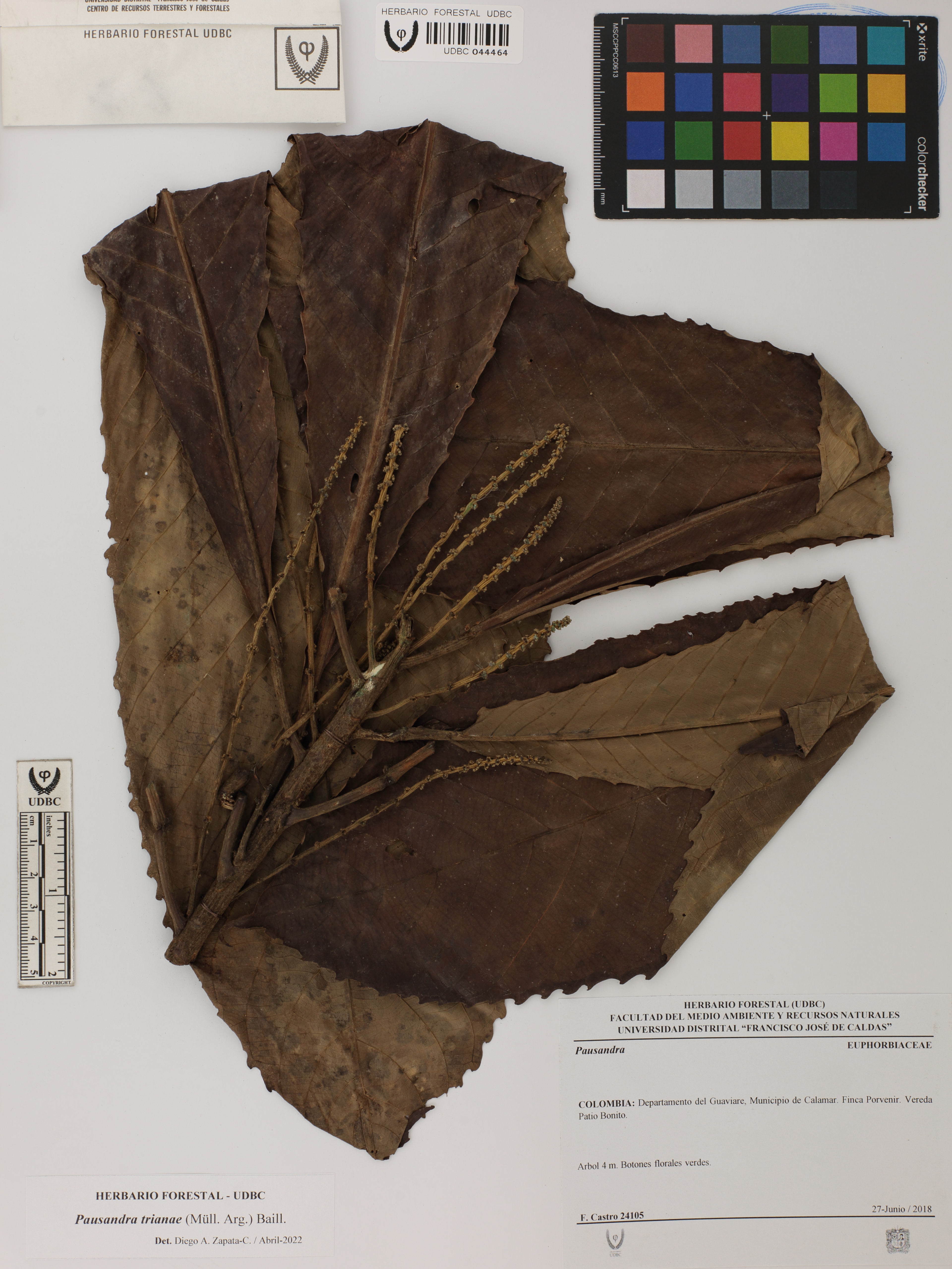 Fotografía del ejemplar Castro, F. 24105, determinado como Pausandra trianae en el año 2022