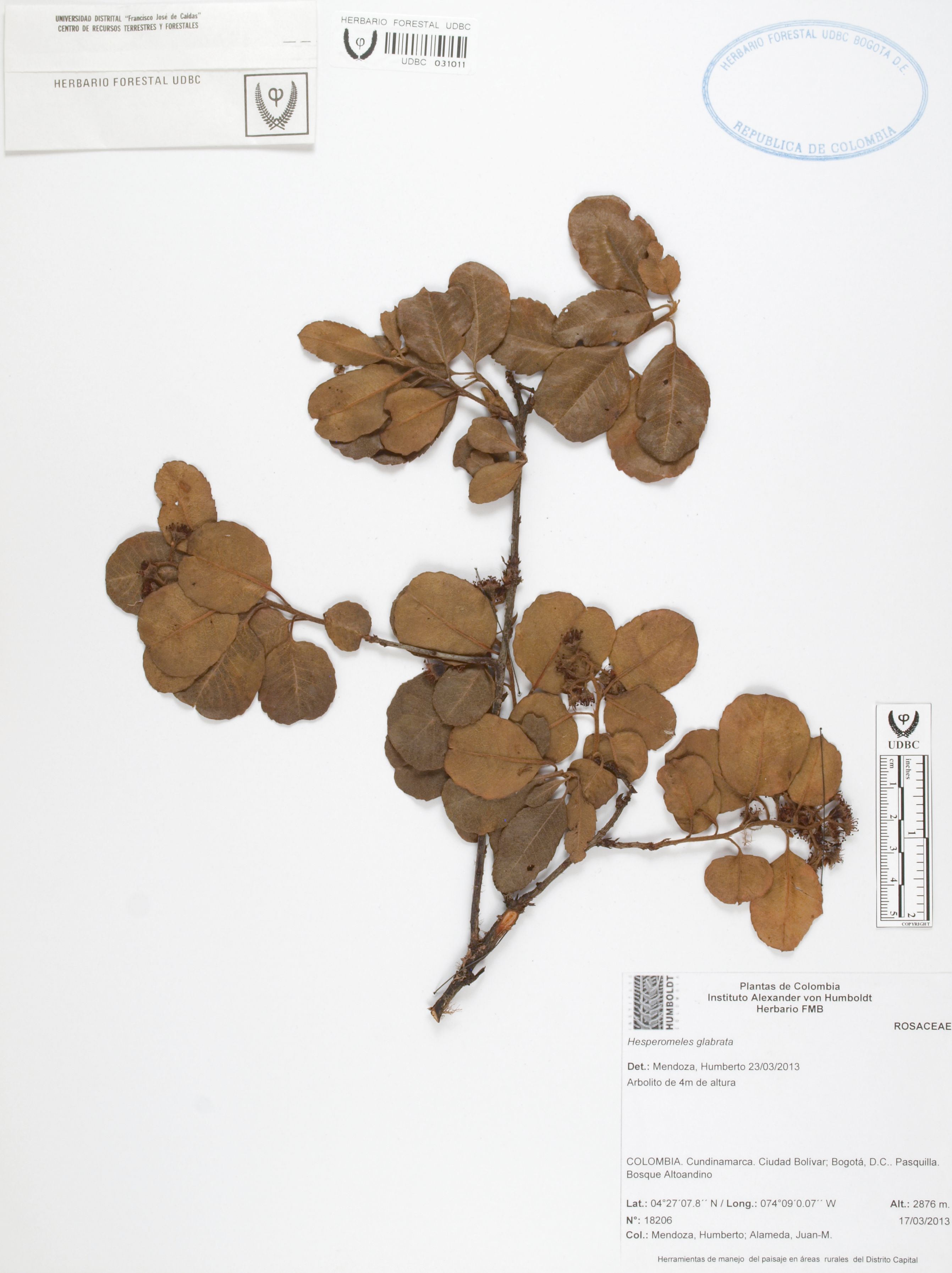 Fotografía del ejemplar Mendoza, H. 18206, determinado como Hesperomeles glabrata en el año 2013