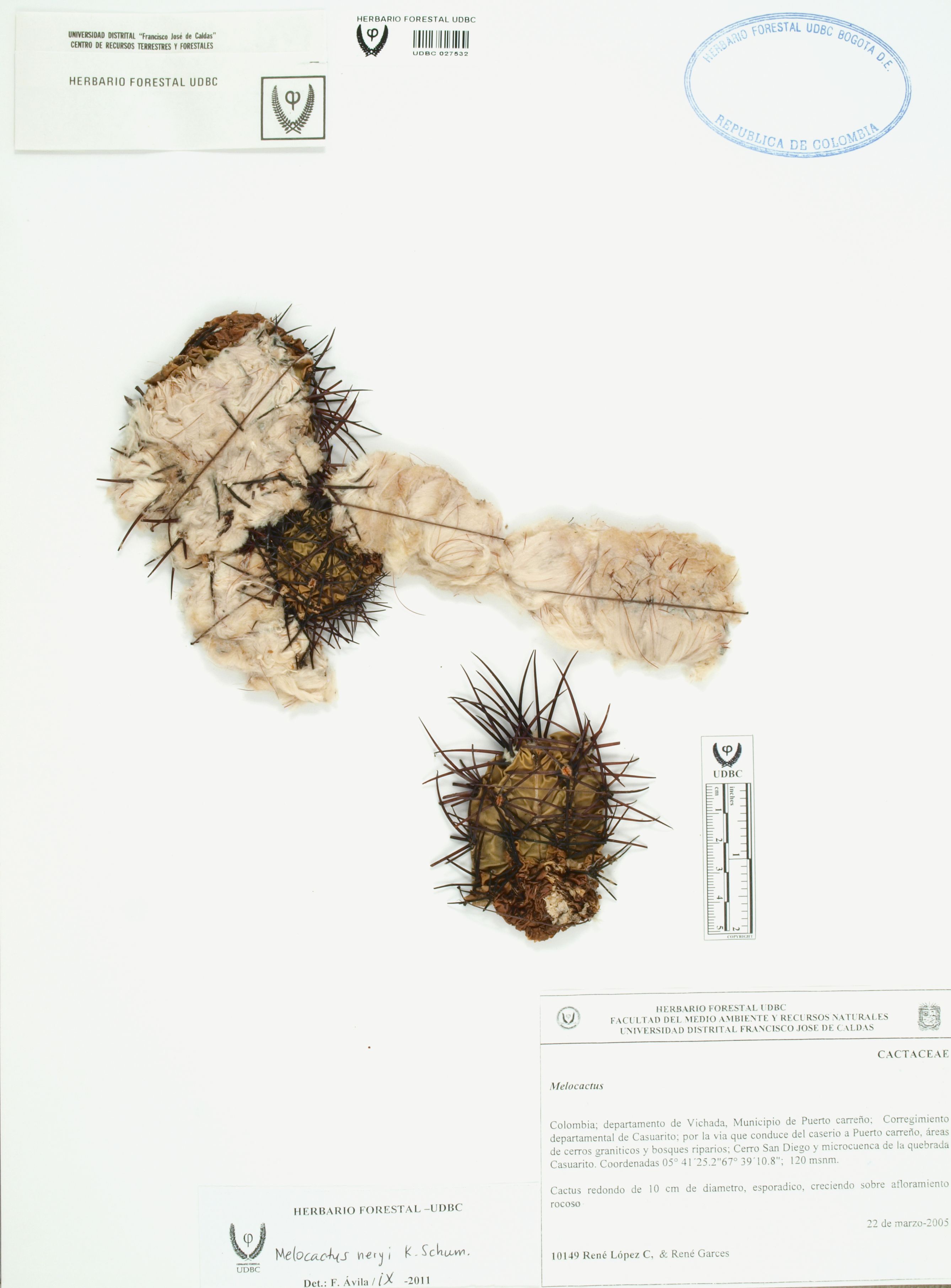 Fotografía del ejemplar López, R. 10149, determinado como Melocactus neryi en el año 2011