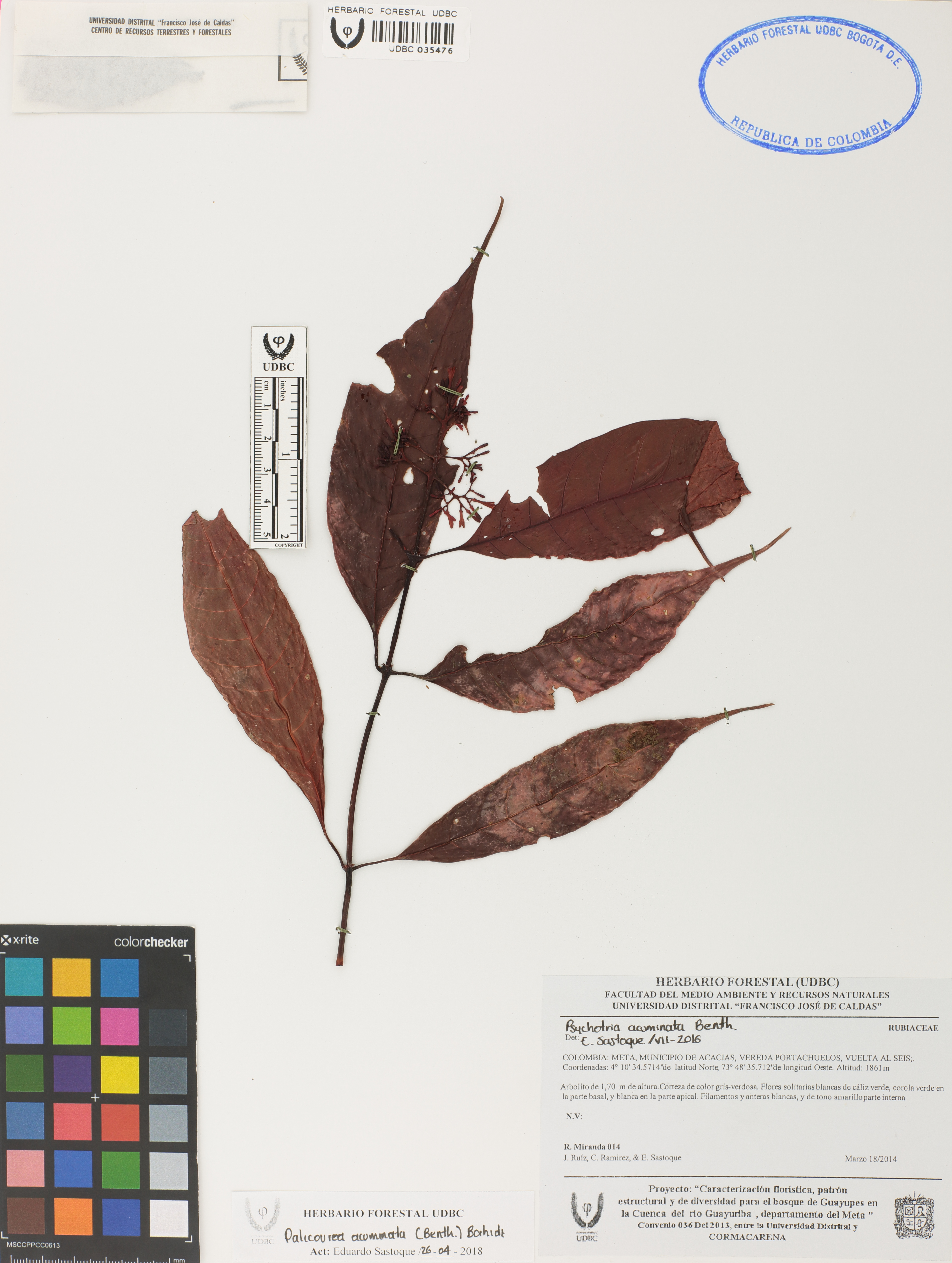 Fotografía del ejemplar Miranda, R. 14, determinado como Palicourea acuminata en el año 2016