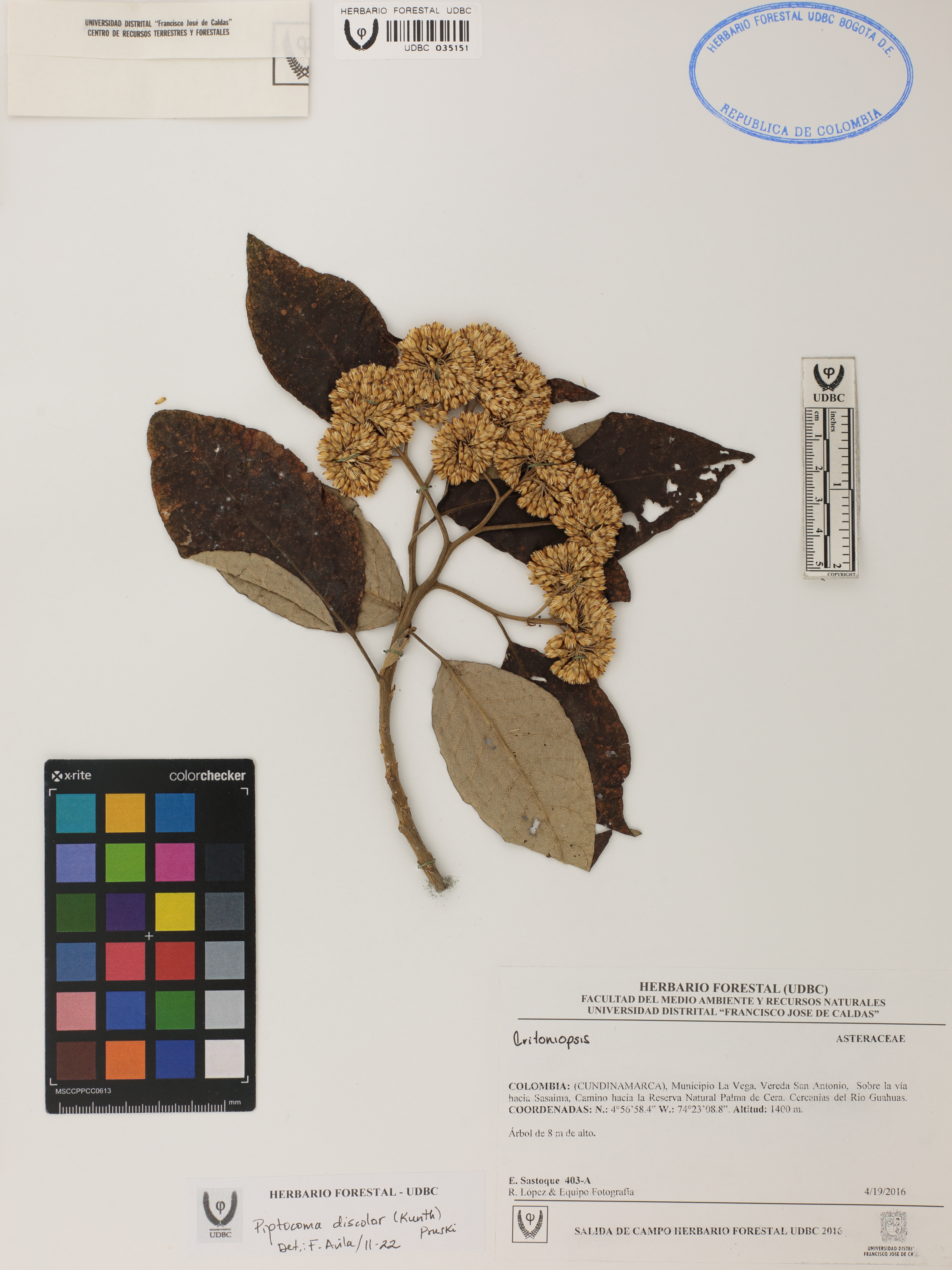Fotografía del ejemplar Sastoque, E. 403, determinado como Piptocoma discolor en el año 2022