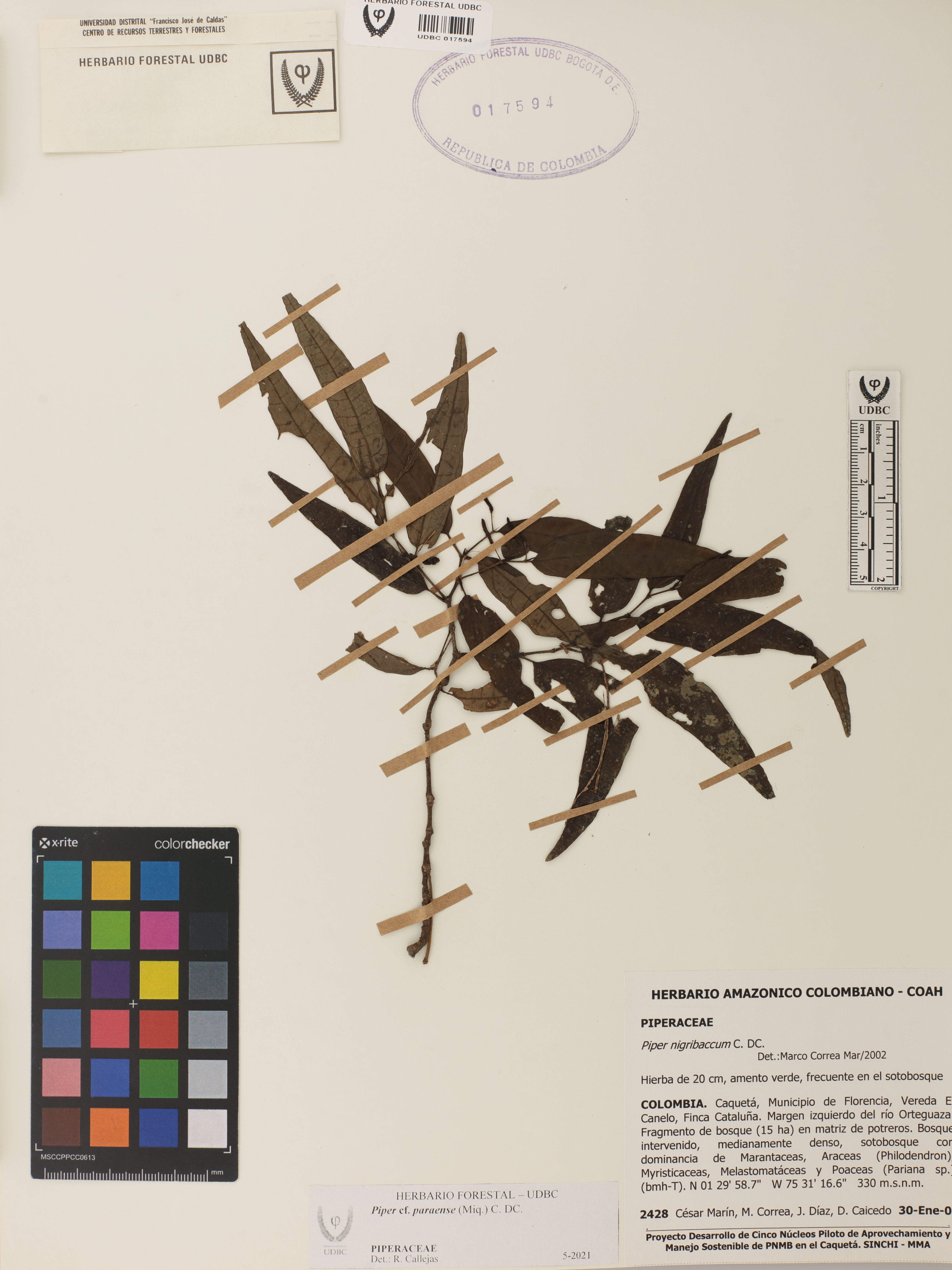 Fotografía del ejemplar Marín, C. 2428, determinado como Piper paraense en el año 2021