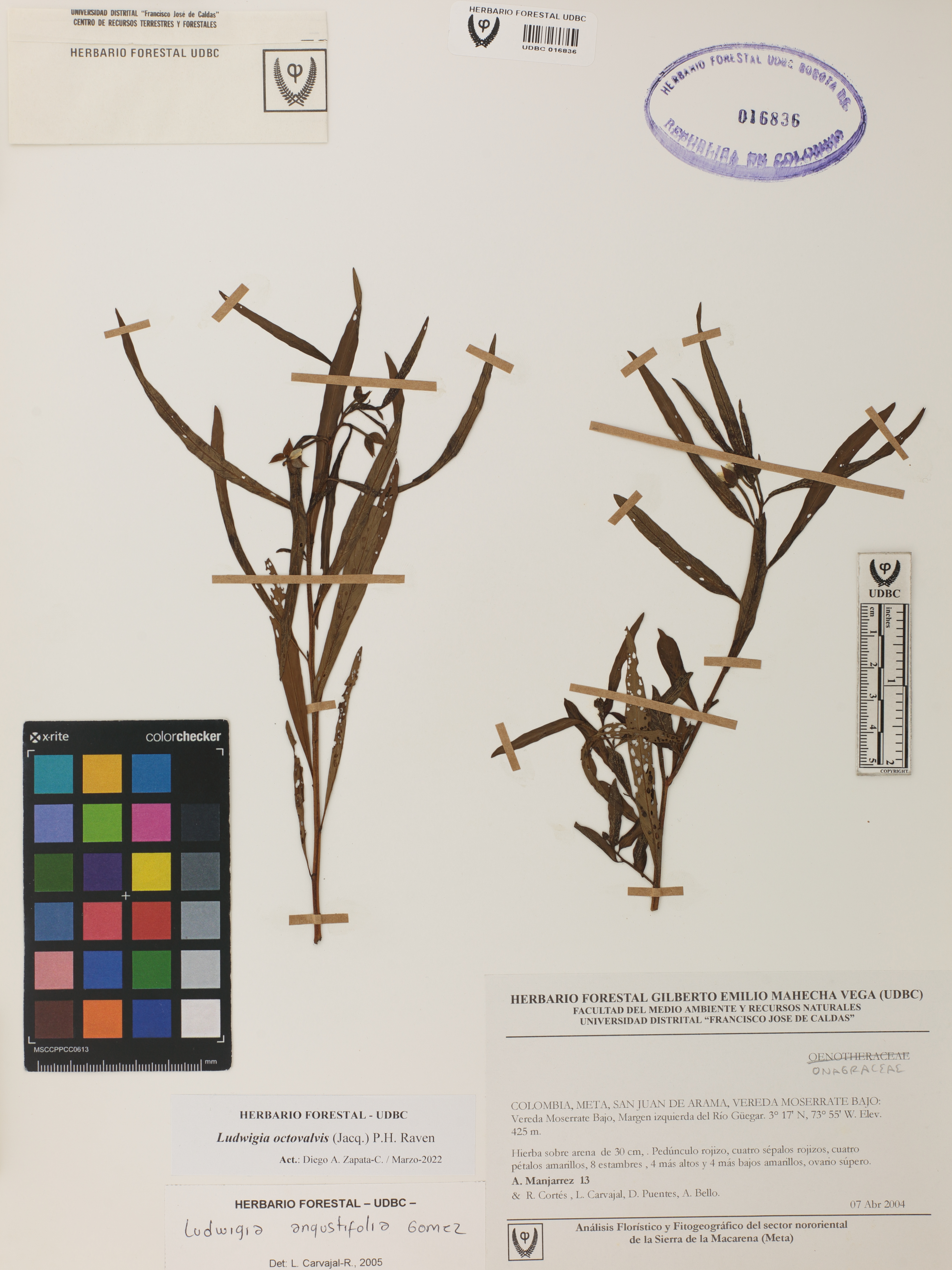 Fotografía del ejemplar Manjarrez, A. 13, determinado como Ludwigia octovalvis en el año 2005