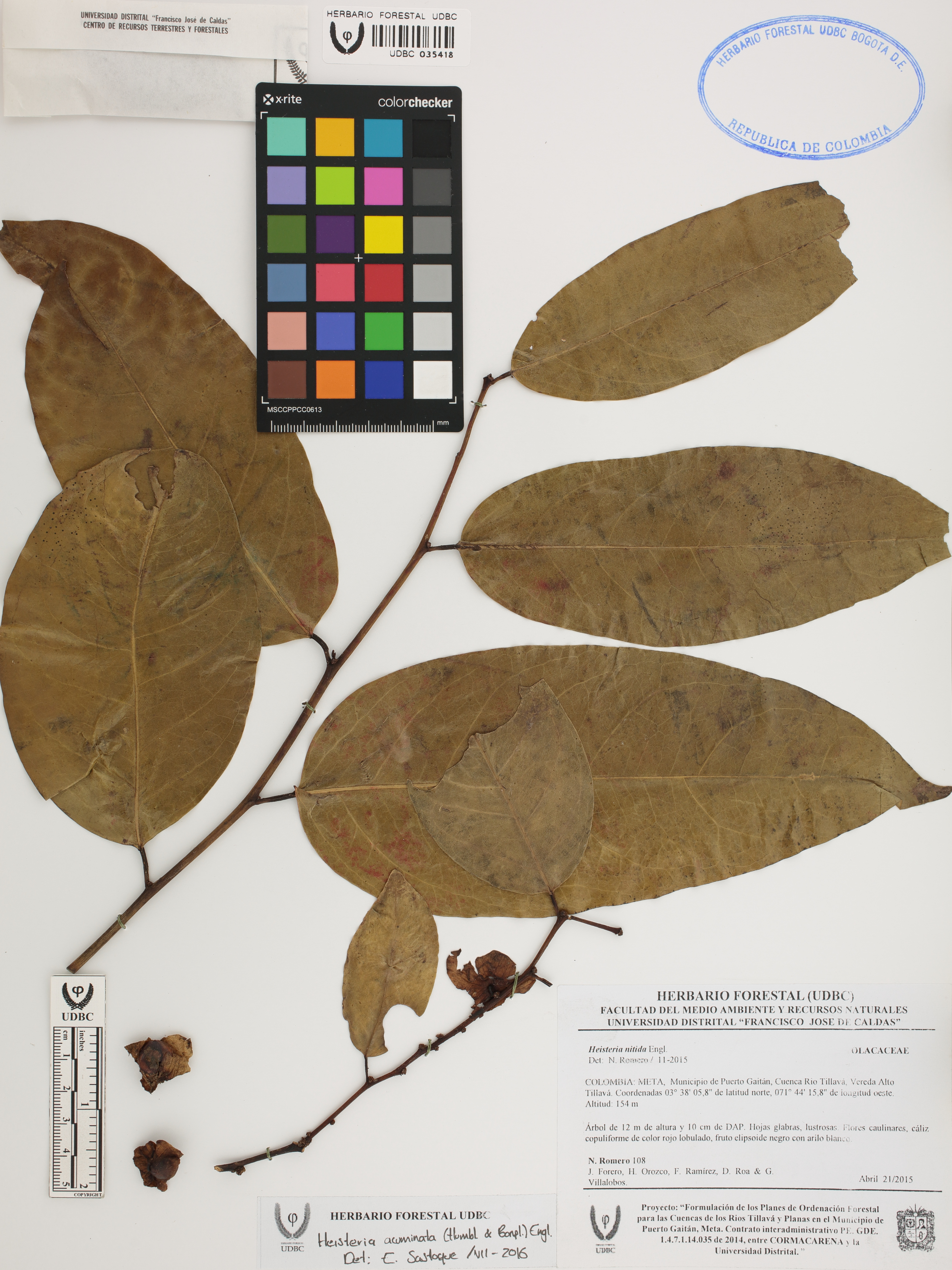 Fotografía del ejemplar Romero, N. 108, determinado como Heisteria acuminata en el año 2016