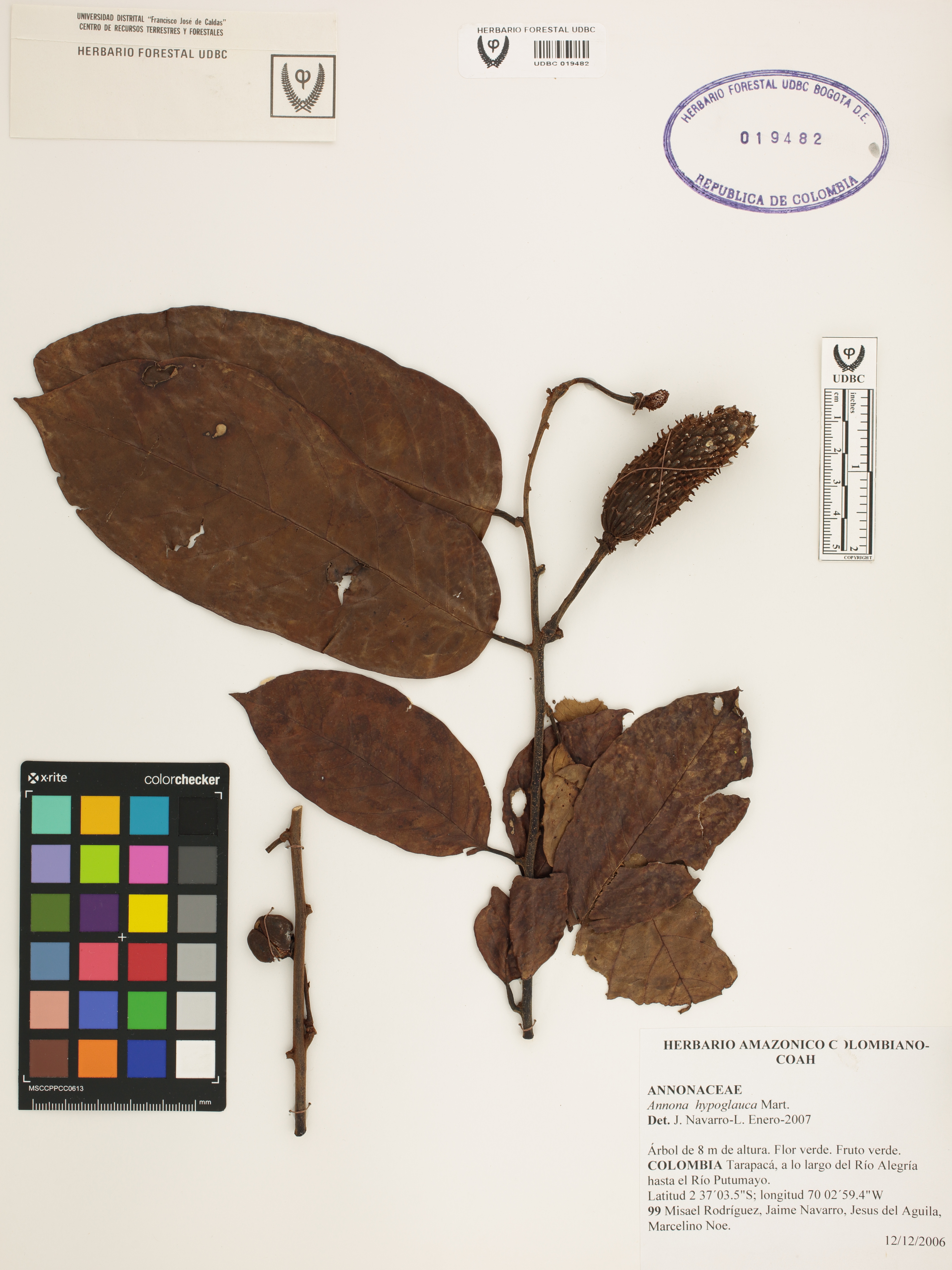 Fotografía del ejemplar Rodríguez, M. 99, determinado como Annona hypoglauca en el año 2007