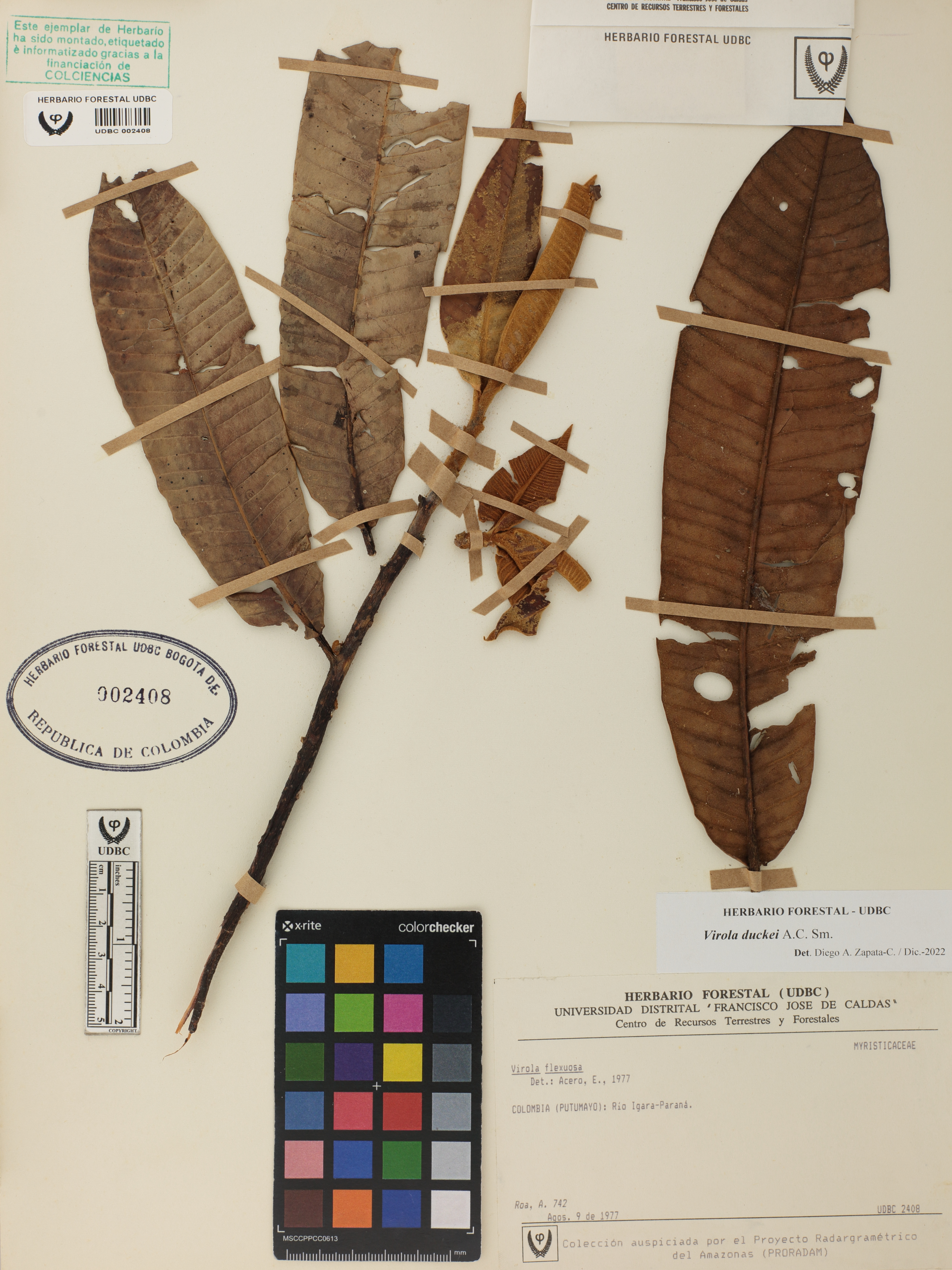 Fotografía del ejemplar Roa, A. 742, determinado como Virola duckei en el año 2022