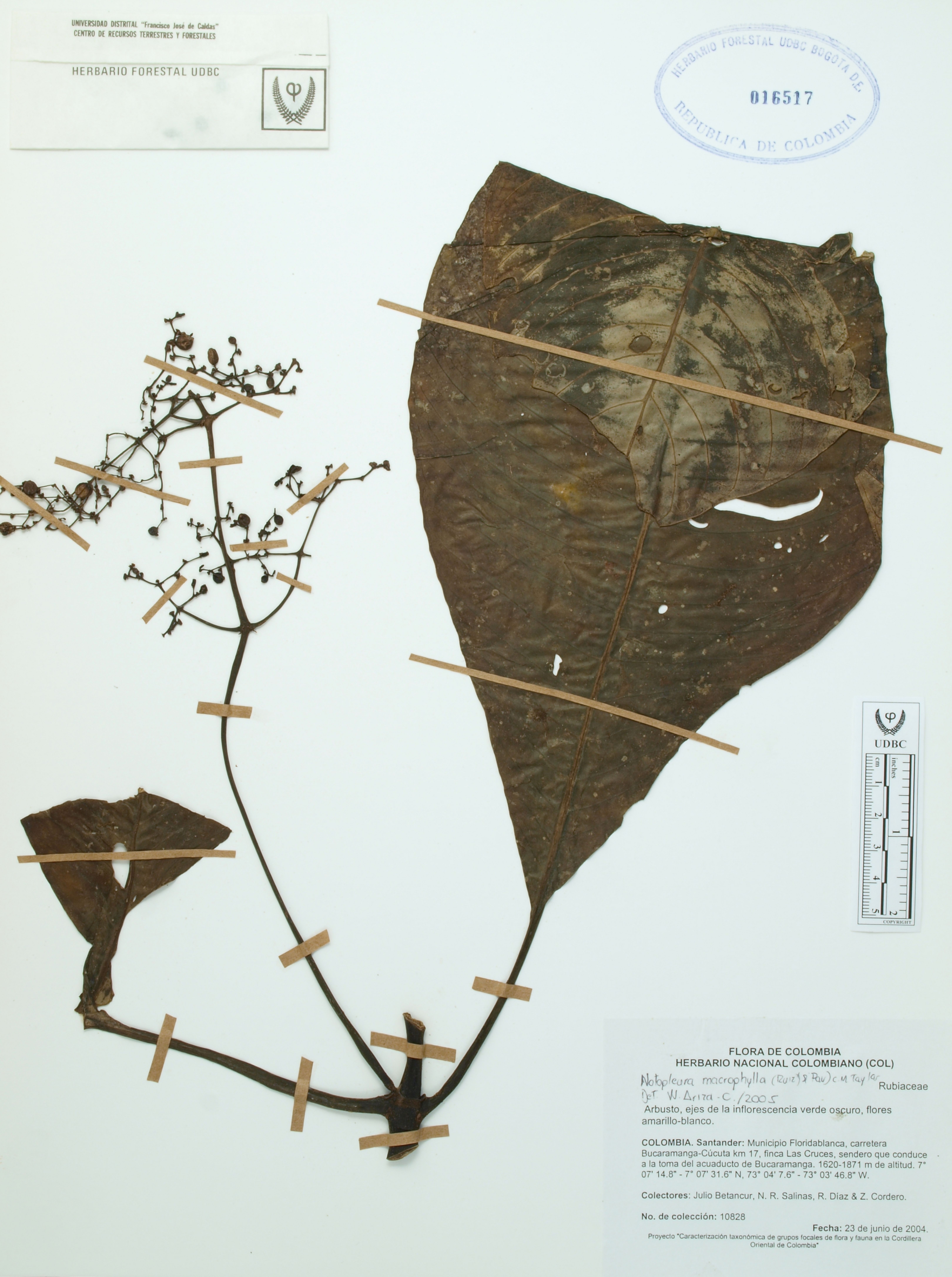 Fotografía del ejemplar Betancur, J. 10828, determinado como Notopleura macrophylla en el año 2005