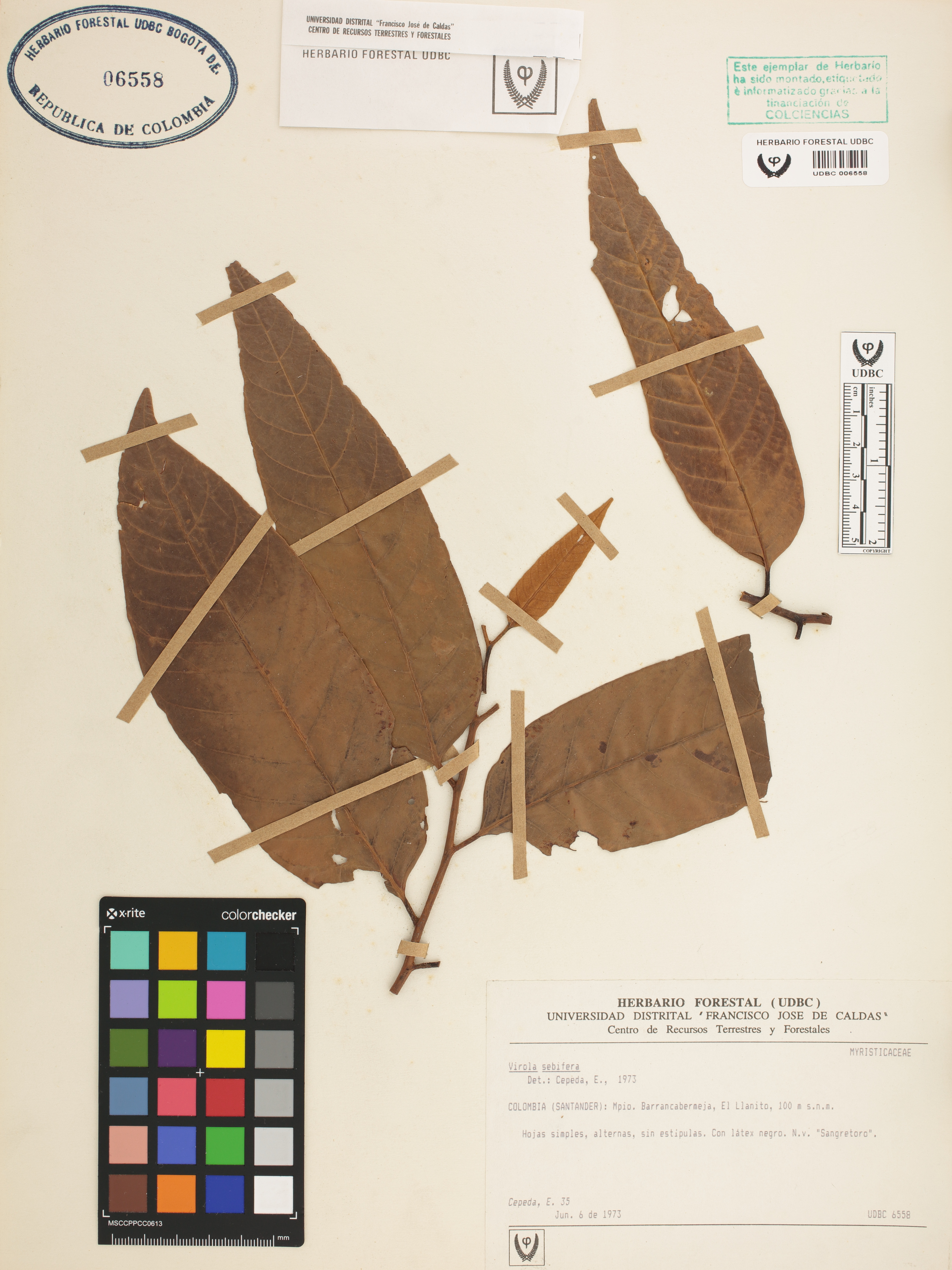 Fotografía del ejemplar Cepeda, E. 35, determinado como Virola sebifera en el año 1973
