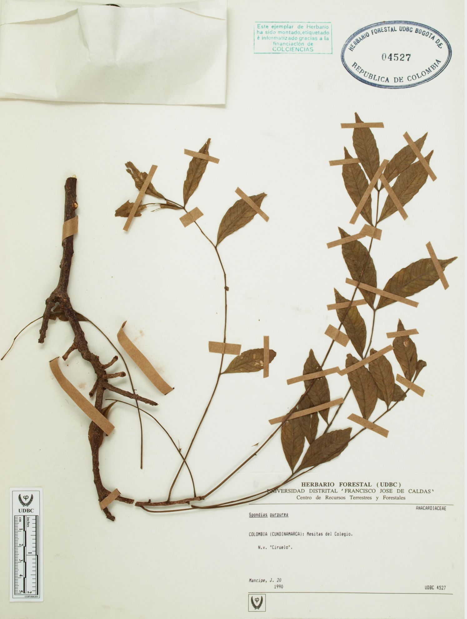 Fotografía del ejemplar Mancipe, J. 20, determinado como Spondias purpurea