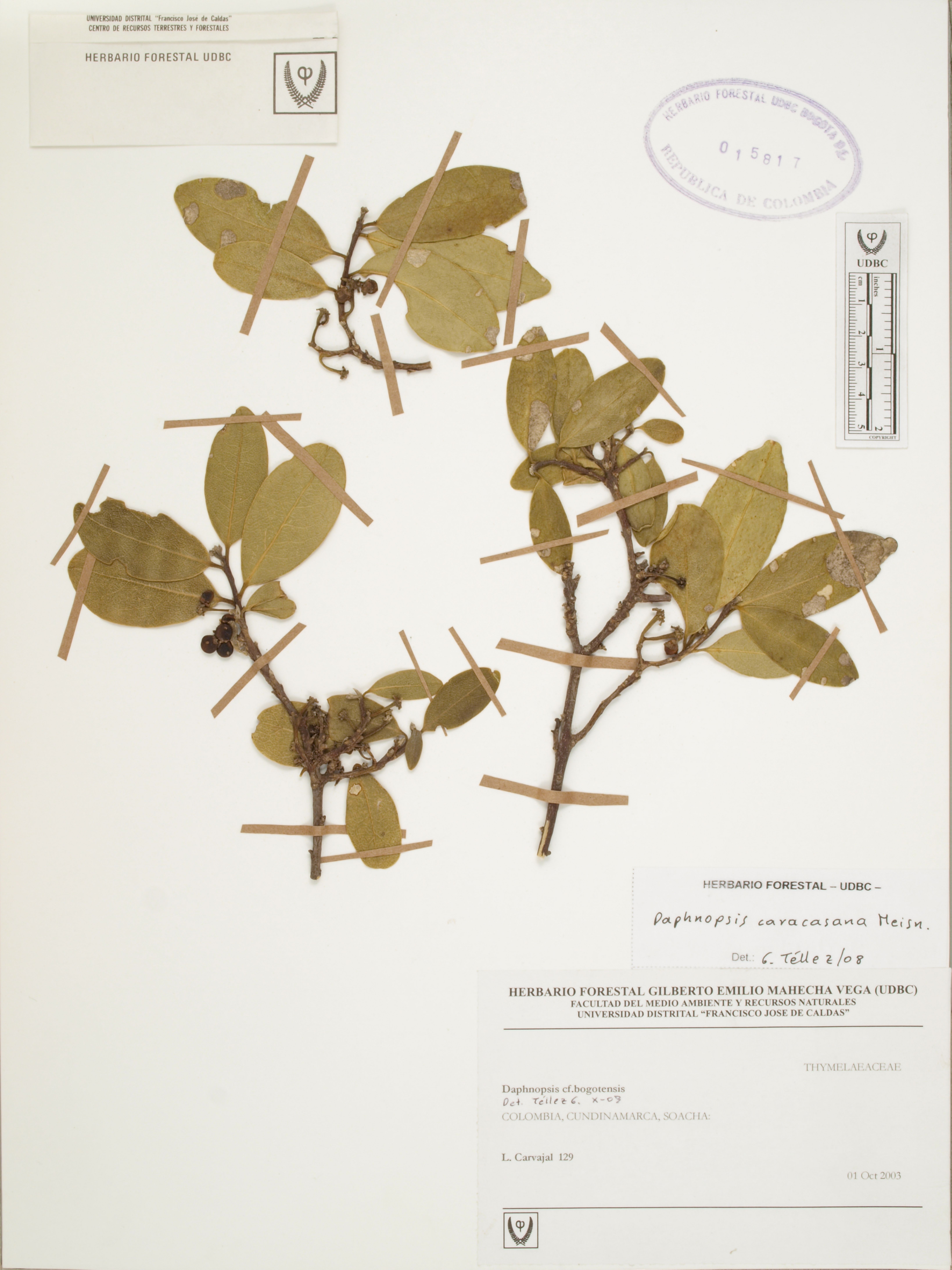 Fotografía del ejemplar Carvajal, L. 129, determinado como Daphnopsis caracasana en el año 2008