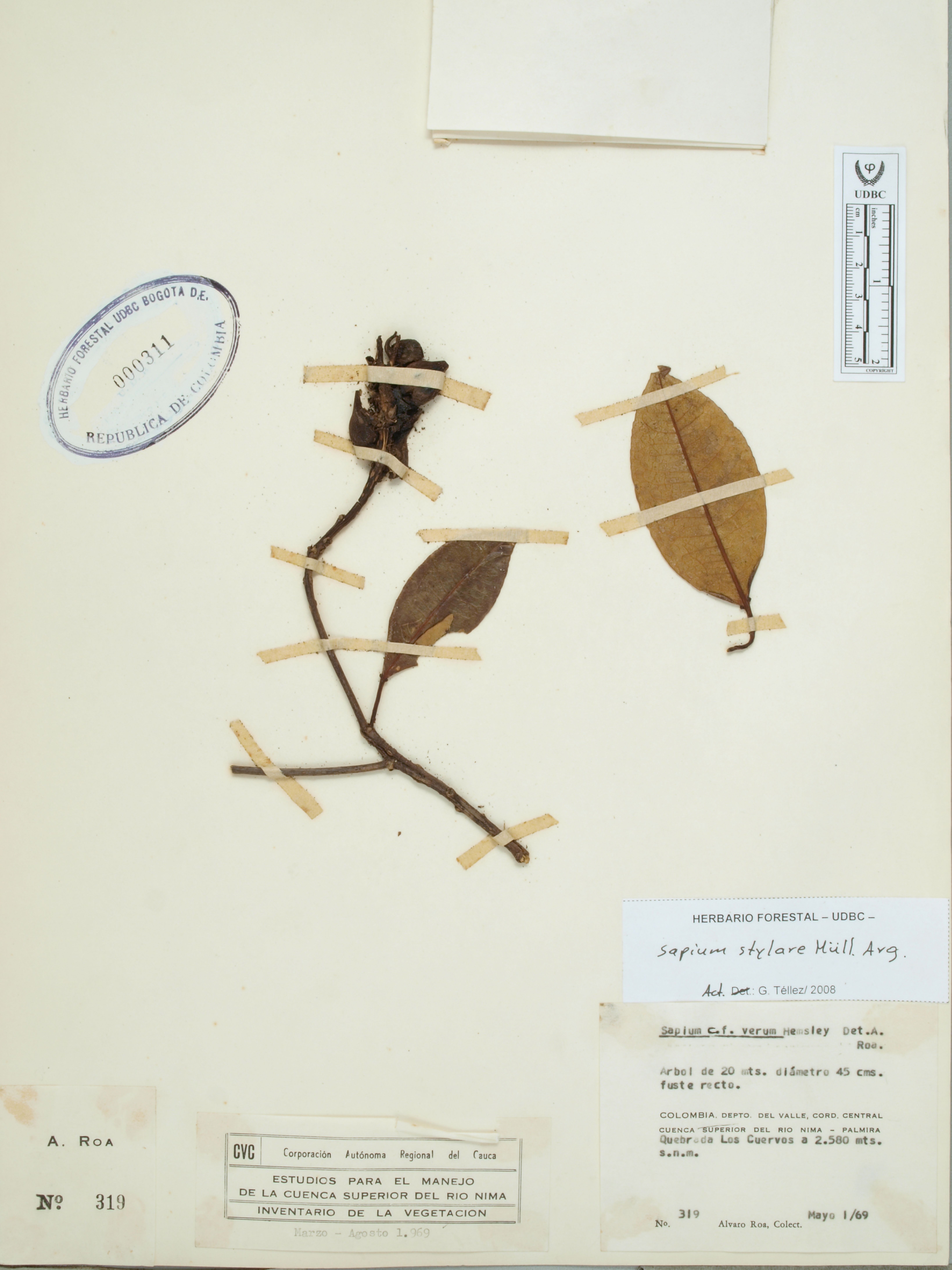 Fotografía del ejemplar Roa, A. 319, determinado como Sapium stylare en el año 2008