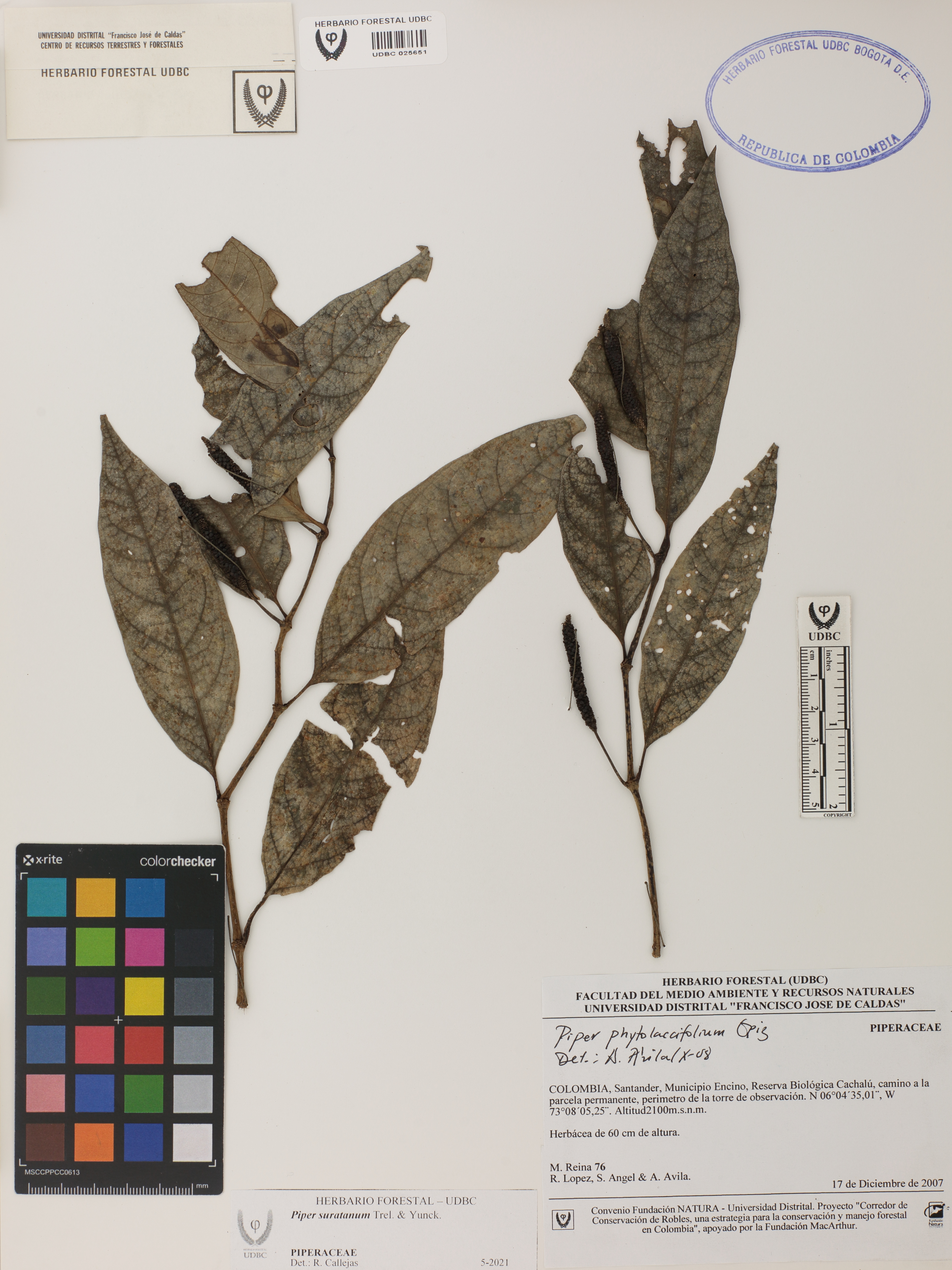 Fotografía del ejemplar Reina, M. 76, determinado como Piper suratanum en el año 2021
