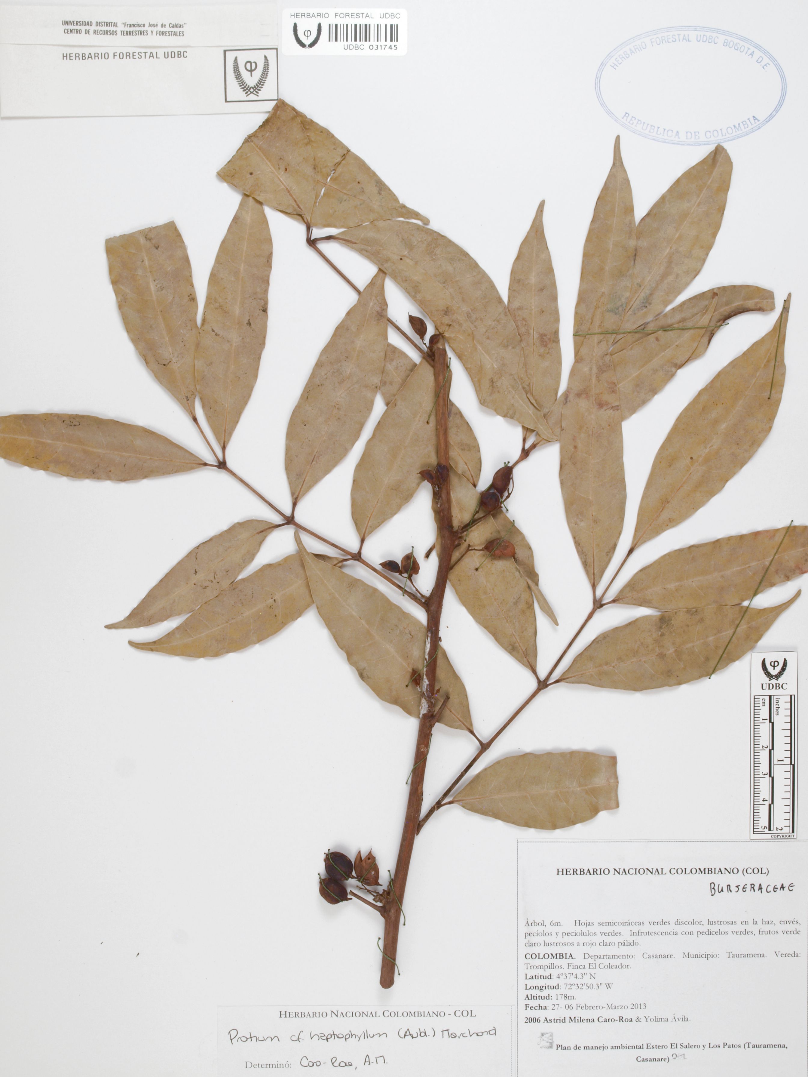 Fotografía del ejemplar Caro-Roa, A. 2006, determinado como Protium heptaphyllum